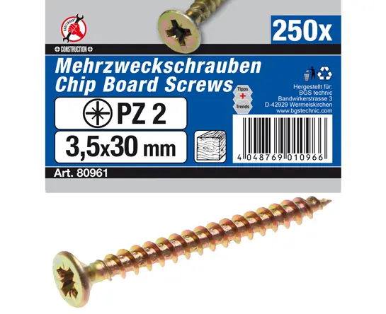 Víceúčelové šrouby s křížovou drážkou PZ2 o rozměrech 3,5 x 30 mm jsou určeny pro široké spektrum montážních prací v domácnosti i dílně. Díky univerzálnímu provedení je lze použít při spojování dřeva, dřevotřísky, plastů nebo tenkých kovových materiálů.