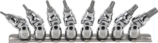 Tato sada nástrčných hlavic s kardanovým kloubem je určena pro práci s T-profilem (Torx) v rozsahu T8 až T40. Obsahuje osm hlavic, které pokrývají nejběžnější velikosti používané v automobilovém průmyslu, domácích dílnách i při montáži elektroniky. Díky univerzálnímu rozměru 6,3 mm (1/4") je kompatibilní s většinou běžných ráčen a prodlužovacích nástavců.