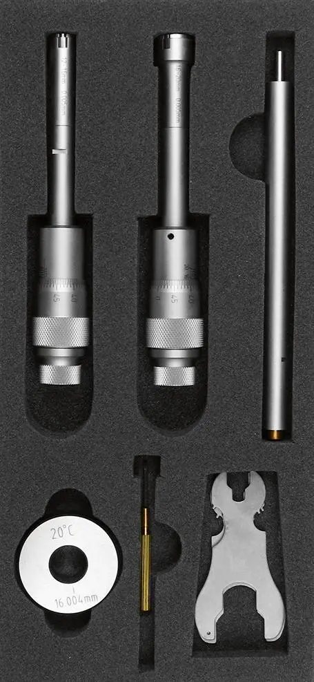 Súčasťou sú vymeniteľné meracie hlavice, ktoré pokrývajú celý uvedený rozsah. Presnosť merania je zabezpečená precíznym spracovaním a kalibráciou každého kusu. Súprava je vhodná na kontrolu tolerancie otvorov v kovových a nekovových materiáloch.