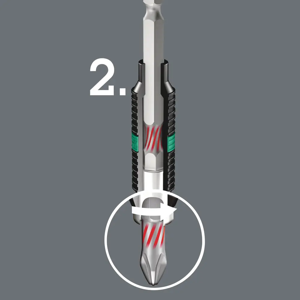 Torzní zóna, do které je při zátěžových špičkách odvedena kinetická energie. S měkčí torzní zónou pro zabránění deformace špičky bitu při vysokém zatížení. Díky tomu výrazné prodloužení životnosti produktu. Houževnaté provedení, pro univerzální použití. Šestihran 1/4", vhodný pro držáky podle DIN ISO 1173-D 6,3.