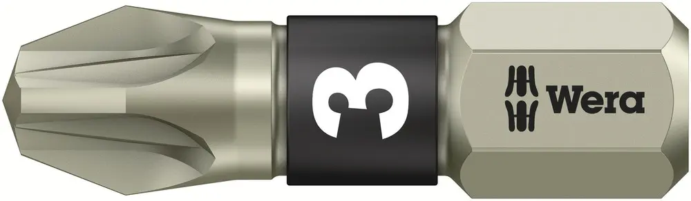• Kvalitní bity z nerezové oceli na šrouby Pozidriv. Nerezové nářadí Wera se vyrábí z nerezové oceli, čímž se zabraňuje přenosu nevzhledné cizí rzi. S torzní zónou: u torzních bitů jsou špičky utahovacích momentů tlumeny v torzní zóně. Předchází se tak předčasnému opotřebení, zvyšuje se životnost bitu. Šestihran 1/4", vhodný pro držáky podle DIN ISO 1173-D 6,3.
