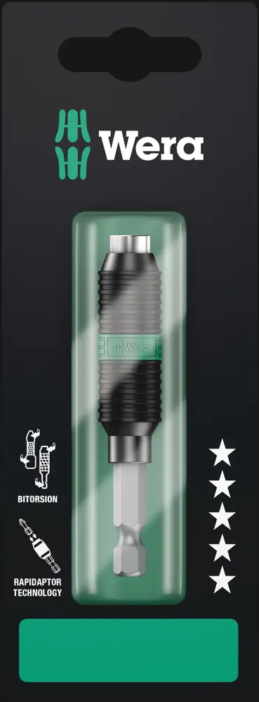 Univerzální držák pro upnutí bitů s připojovacím rozměrem vnějšího šestihranu 1/4" podle DIN ISO 1173-C 6,3 a E 6,3 (ISO 1173). Držáky BiTorsion od firmy Wera mají zkrutnou pružinu, která zachytí menší špičky zatížení při šroubování. Společné použití bitů BiTorsion a jejich torzní zóny výrazně prodlužuje životnost nářadí. Držáky BiTorsion od firmy Wera lze však také použít s běžnými bity. Technologie Rapidaptor umožňuje upnutí bitů i bez manipulace s pouzdrem. Vyjmutí bitu se provádí jednoduchým posunutím směrem dopředu - pro bleskovou výměnu bitů, také jen jednou rukou. Šestihran 1/4", vhodný pro šroubovací zařízení s upnutím podle DIN ISO 1173-F 6,3.
