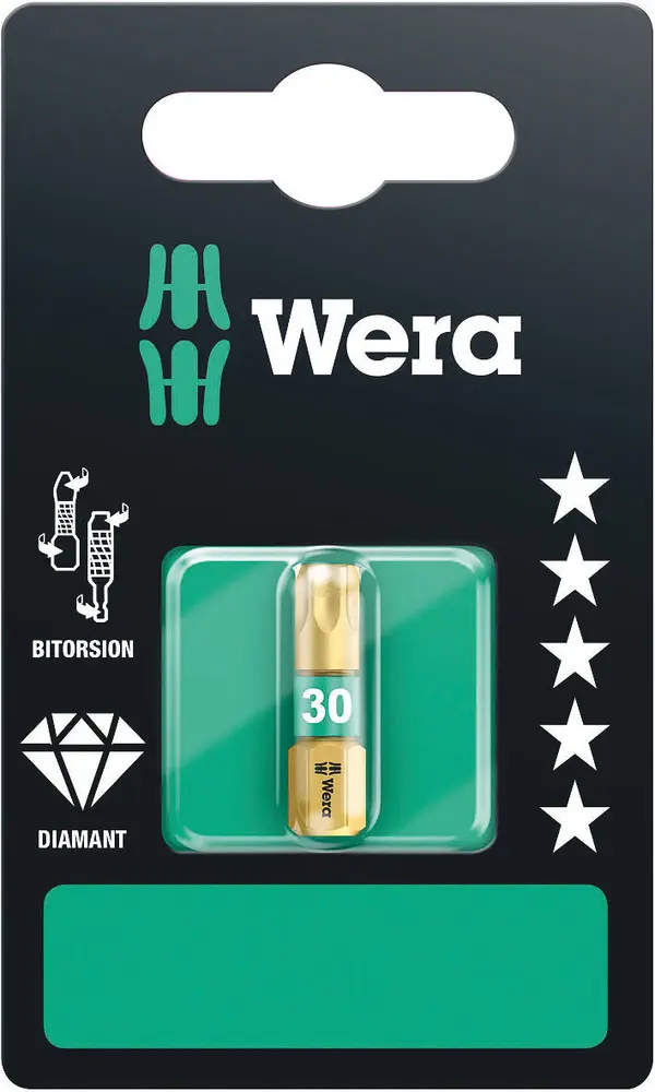 • Bity na šrouby s vnitřním profilem TORX® s miniaturními diamantovými částicemi na špičce bitu. Tyto částice zajišťují bezpečné uchycení v šroubu, redukují potřebný přítlak a snižují nebezpečí sesmeknutí. S torzní zónou, do které je při zátěžových špičkách odvedena kinetická energie. S měkčí torzní zónou pro zabránění deformace špičky bitu při vysokém zatížení. Díky tomu výrazné prodloužení životnosti produktu. Šestihran 1/4", vhodný pro držáky podle DIN ISO 1173-D 6,3.