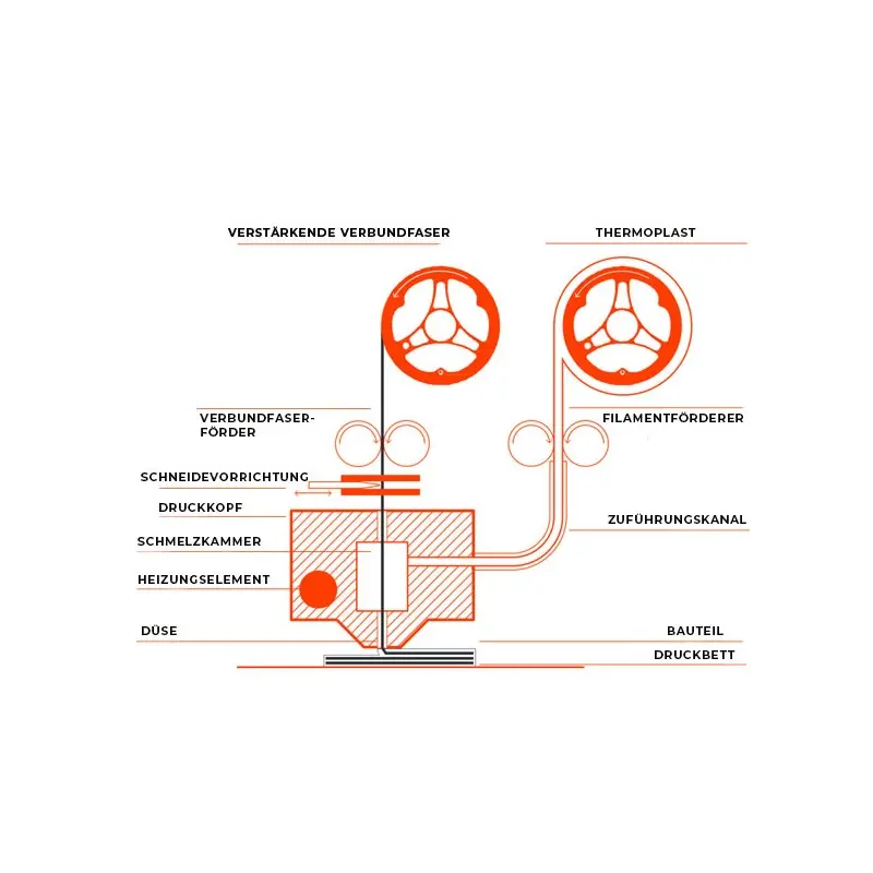 Extrudér má dva vstupy: jeden pre výstužný materiál a druhý pre termoplast