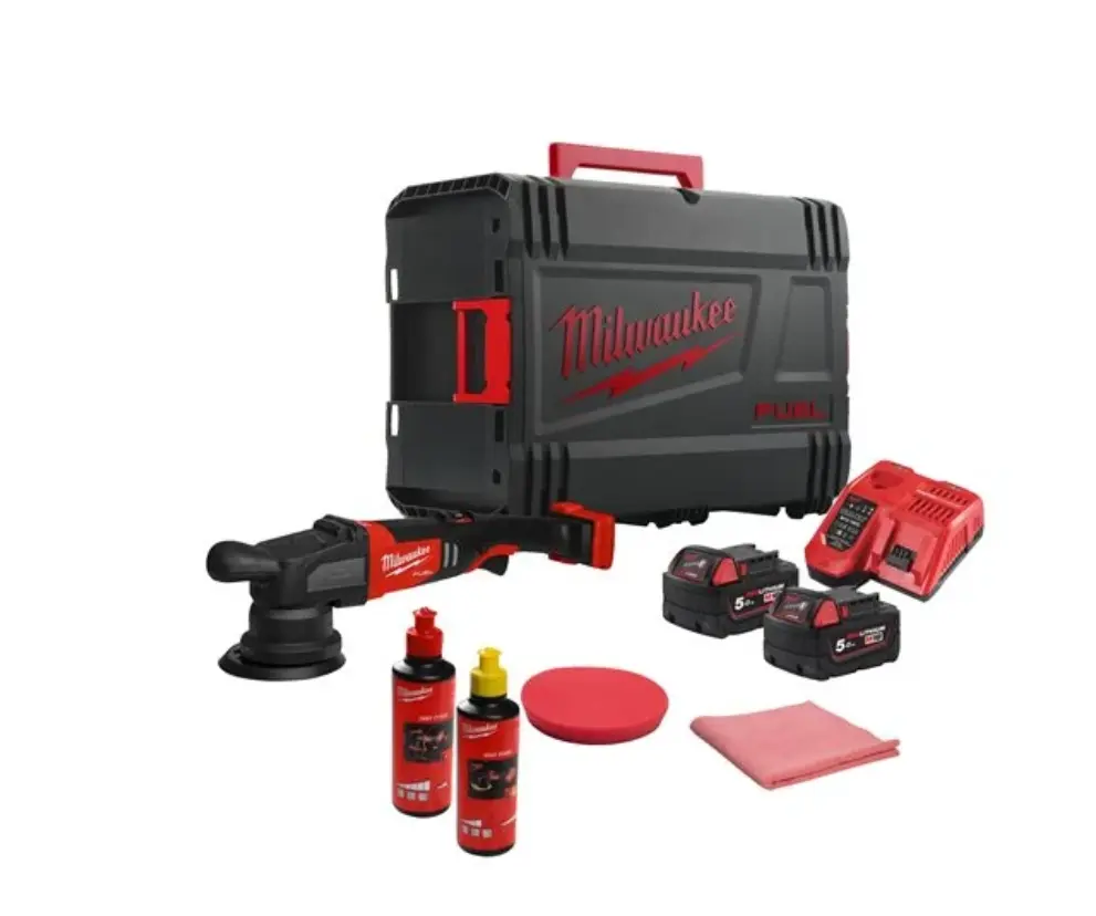 Aku oscilační (excentrická) leštička Milwaukee M18 FROP15-502X KIT v balení s příslušenstvím k leštění, s 2x aku M18 B5, nabíječkou M12-18 FC a kufrem. Oscilační pohyb 15 mm, průměr podložky 125 mm, regulace otáček 2650-5100 ot./min.