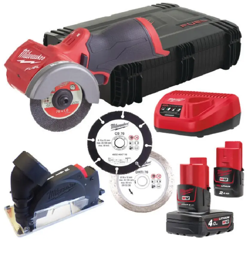Aku kompaktní okružní pila Milwaukee M12 FCOT-422X s kotoučem 76 mm nabízí 20 000 otáček za minutu, prořez 16,3 mm a dvě Li-Ion baterie 12 V. Nízká hmotnost 1,1 kg usnadňuje manipulaci při řezání různých materiálů.