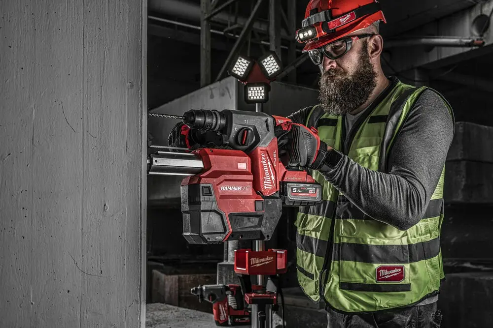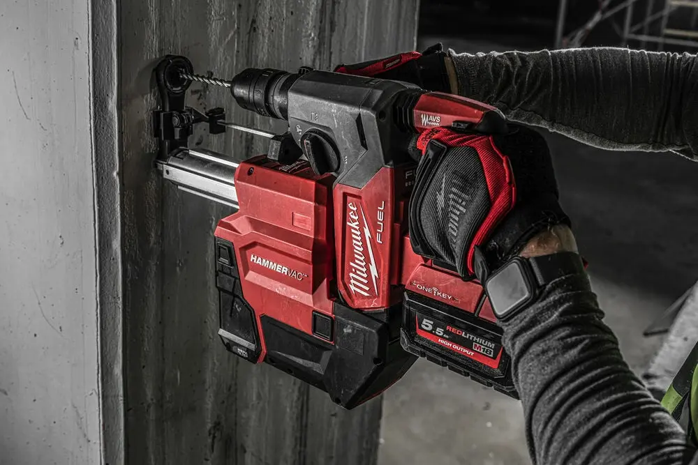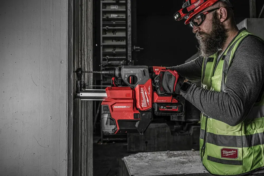 Sada obsahujúca akumulátorové vŕtacie kladivo Milwaukee SDS Plus s maticou Fixtec a špecializované odsávanie pre vŕtacie kladivá