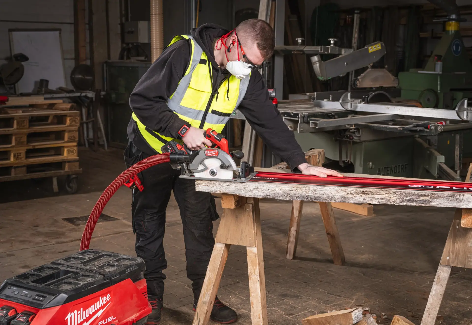 Horčíková pätka kompatibilná s vodiacimi lištami MILWAUKEE®. To umožňuje užívateľovi vykonávať rovné a presné rezy do dosiek a zároveň udržiavať rovnakú líniu rezu pod akýmkoľvek uhlom, čo minimalizuje čas potrebný na nastavenie