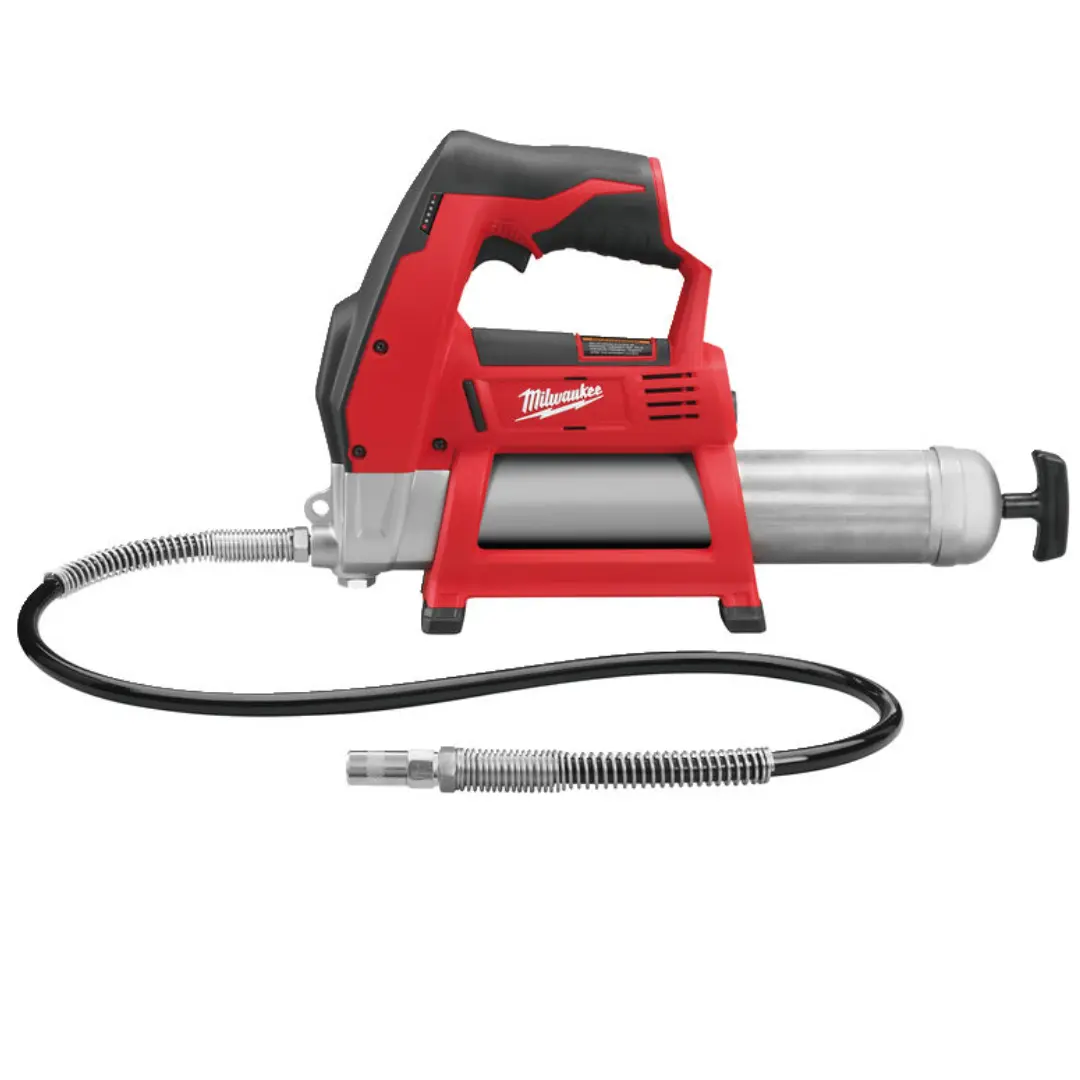 Kompaktní mazací pistole Milwaukee M12 GG-0 s výkonným motorem (12 V), provozní tlak 562 barů, délka 355 mm a hmotnost 3,2 kg. Kapacita zásobníku je 400 ml z kartridže/ 473 ml z velkého balení, ukazatel stavu nabití, kompatibilní s akumulátory M12.