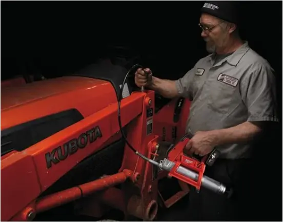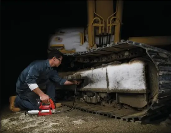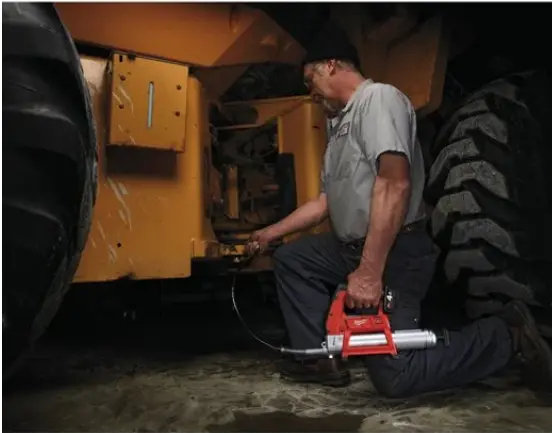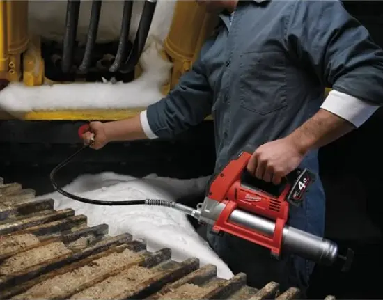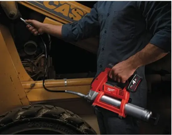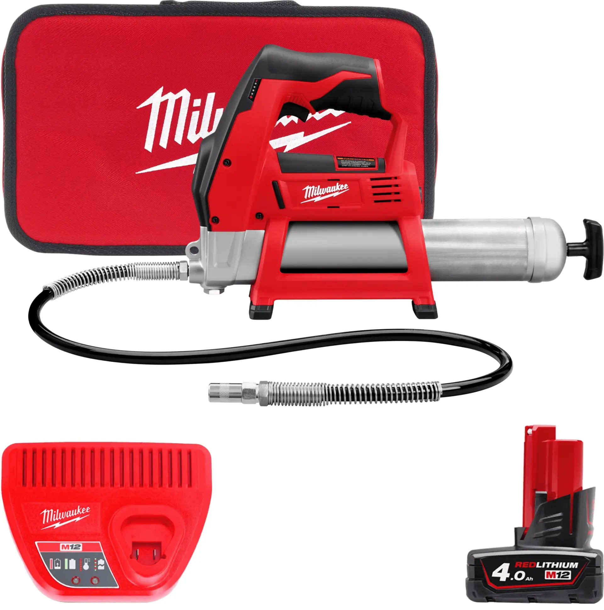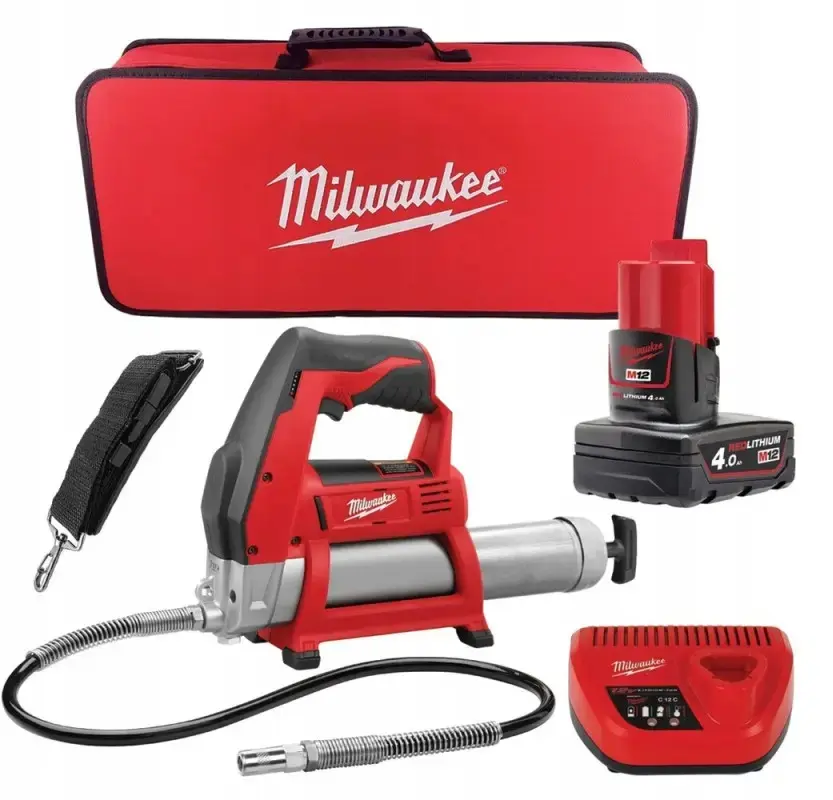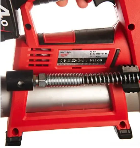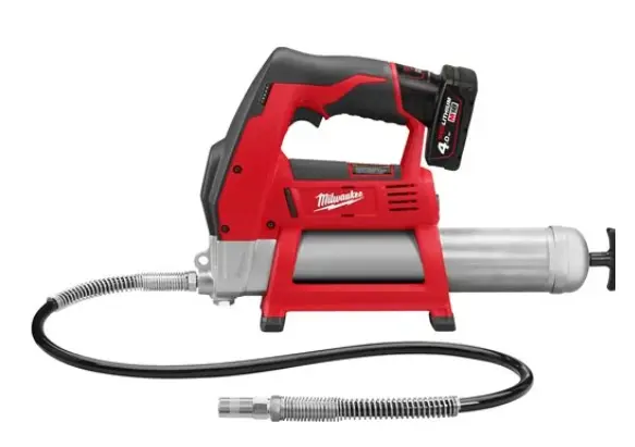 Kompaktní mazací pistole Milwaukee M12 GG-401B s výkonným motorem (12 V), provozní tlak 562 barů, délka 355 mm a hmotnost 3,2 kg. Kapacita zásobníku je 400 ml z kartridže/ 473 ml z velkého balení, ukazatel stavu nabití, kompatibilní s akumulátory M12