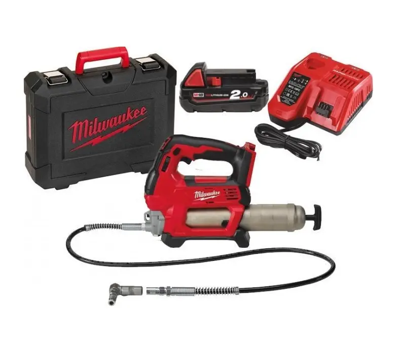 Výkonná mazací pistole Milwaukee M18 GG-201C s výkonným motorem (18 V), provozní tlak 690 barů, délka 355 mm a hmotnost 3,9 kg. Kapacita zásobníku je 400 ml z kartridže/ 473 ml z velkého balení, kompatibilní s akumulátory M18.