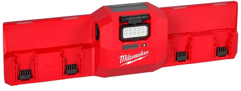 Nabíjačka s dvoma portami M18 a dvoma hybridnými portami M18 a M12, dva 15W porty USB-C, zabudované svetlo 450 lm. Magnetická základňa na montáž na kovové povrchy.