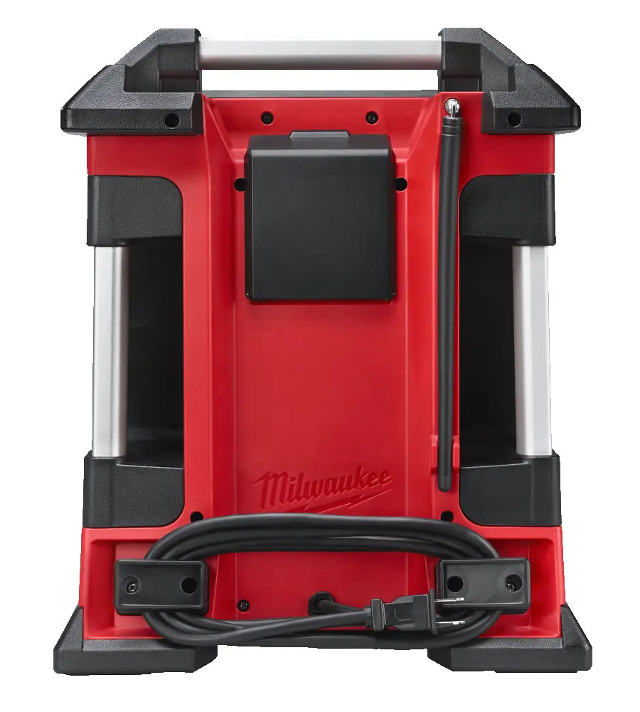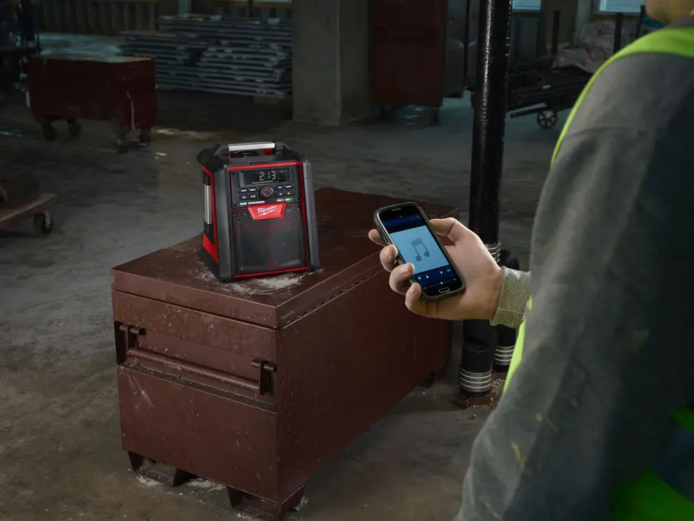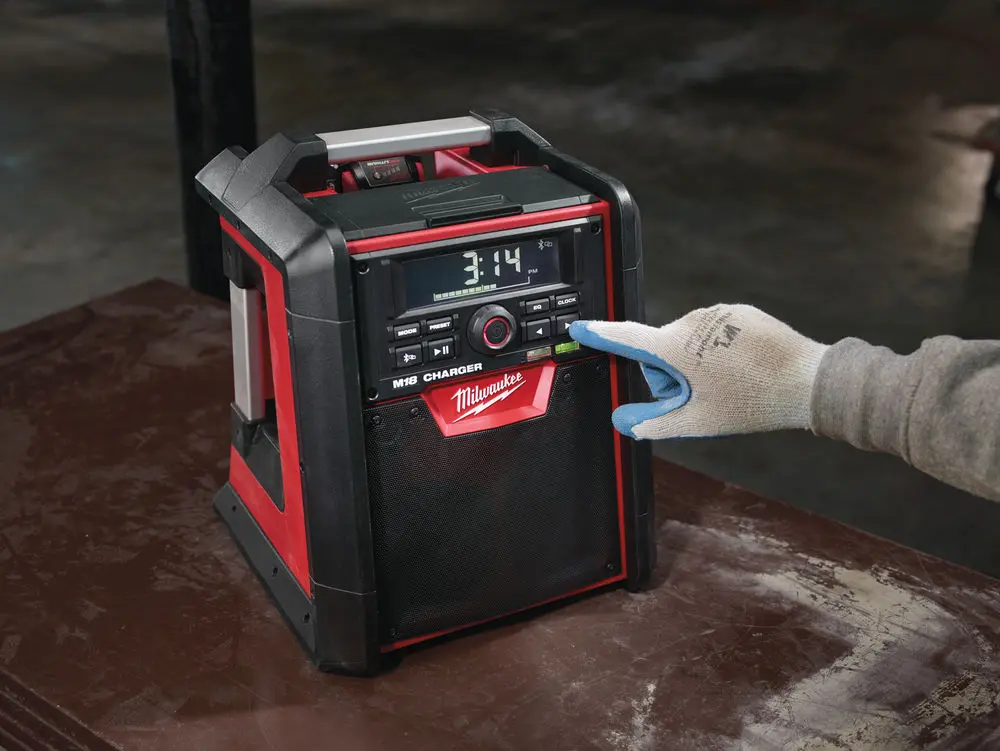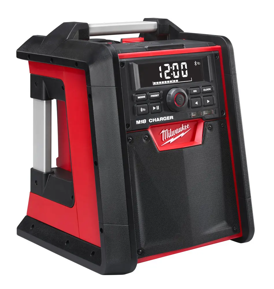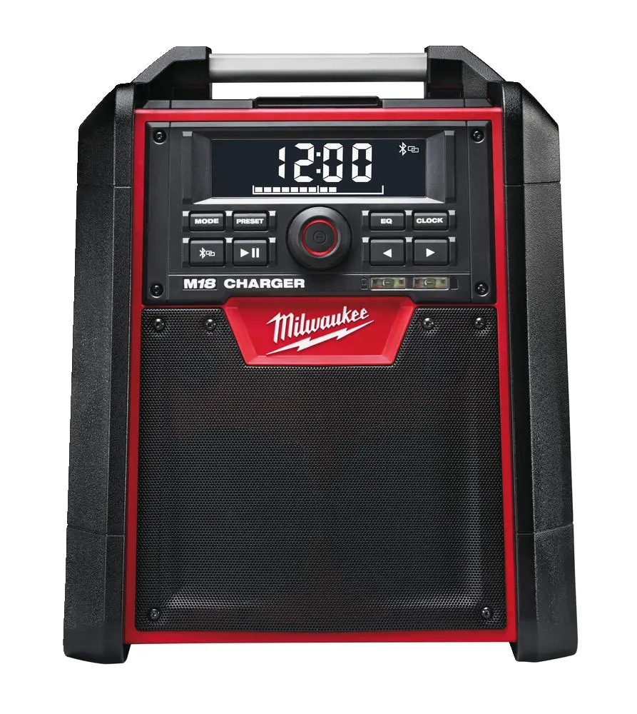 Přenosné aku rádio Milwaukee M18 RC nabízí FM/AM tuner, Bluetooth, 40W reproduktor, USB port a nabíječku M18, vše v robustním provedení bez akumulátoru. Rozměry 300 × 307 × 370 mm, hmotnost 7,7 kg.
