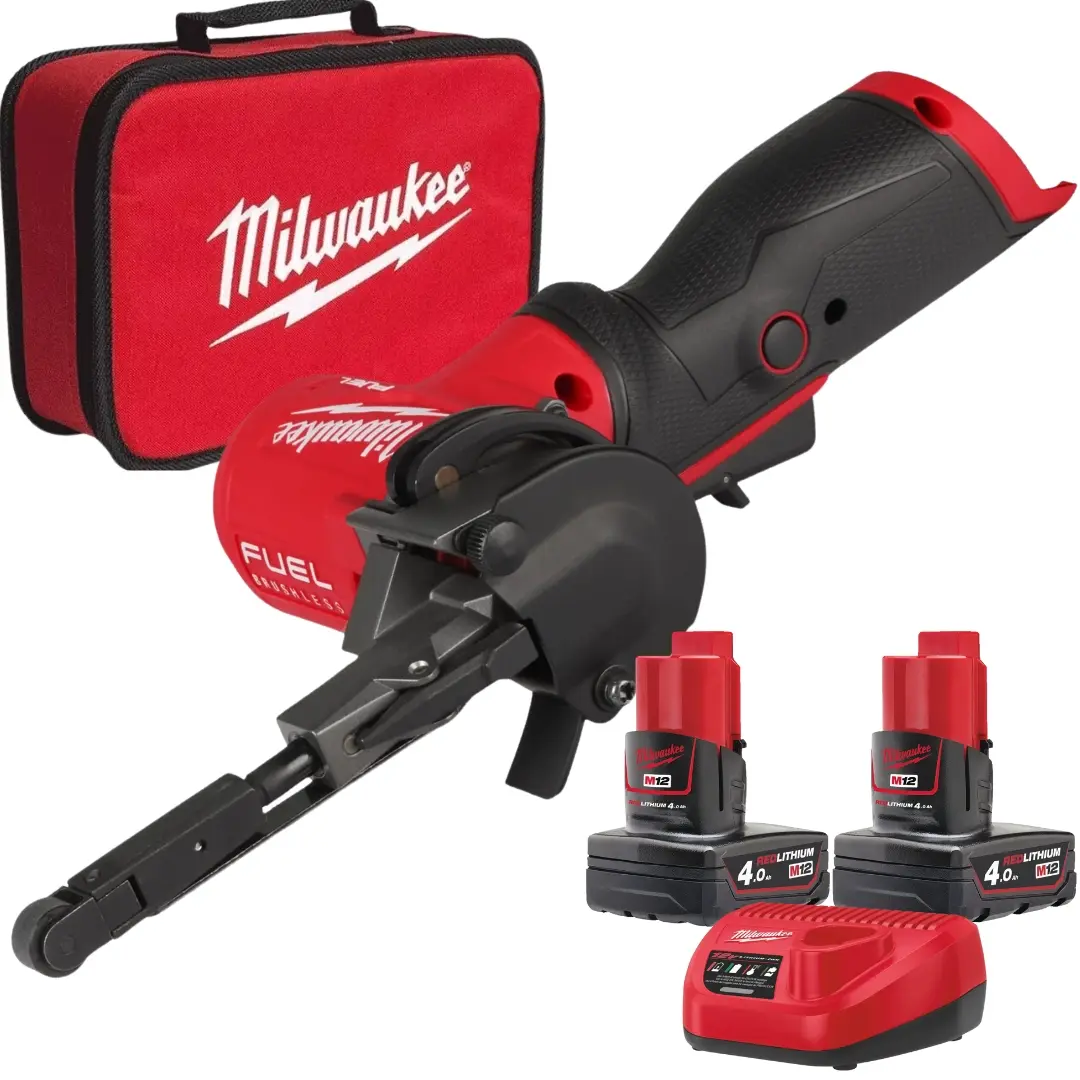 Kvalitná akumulátorová pásová (pilníková) brúska od spoločnosti Milwaukee s označením M12 FBLF10-402B, rozmery pásu 10 x 330 mm, 2 režimy rýchlosti a variabilný spúšťač rýchlosti, balenie s 2x akumulátorom M12B4 (12V, 4,0 Ah) a nabíjačkou C12 C, 2x b