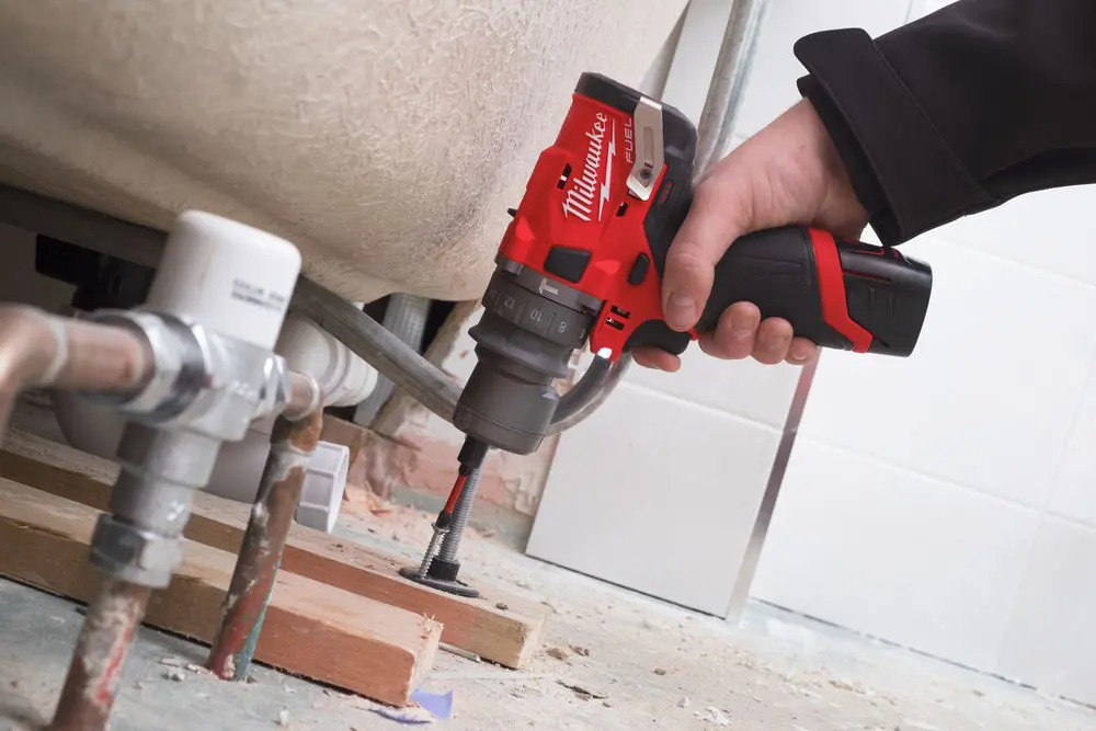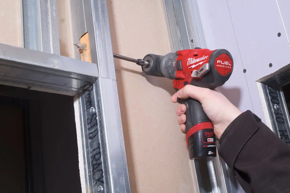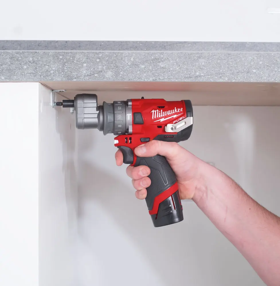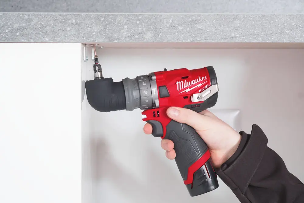 M12 kompaktný vŕtací skrutkovač s príklepom, tromi pracovnými nadstavcami (rýchloupínacie skľučovadlo, pravouhlý a mimoosý nástavec), krútiacim momentom 37 Nm a dvojicou akumulátorov 2,0 Ah.