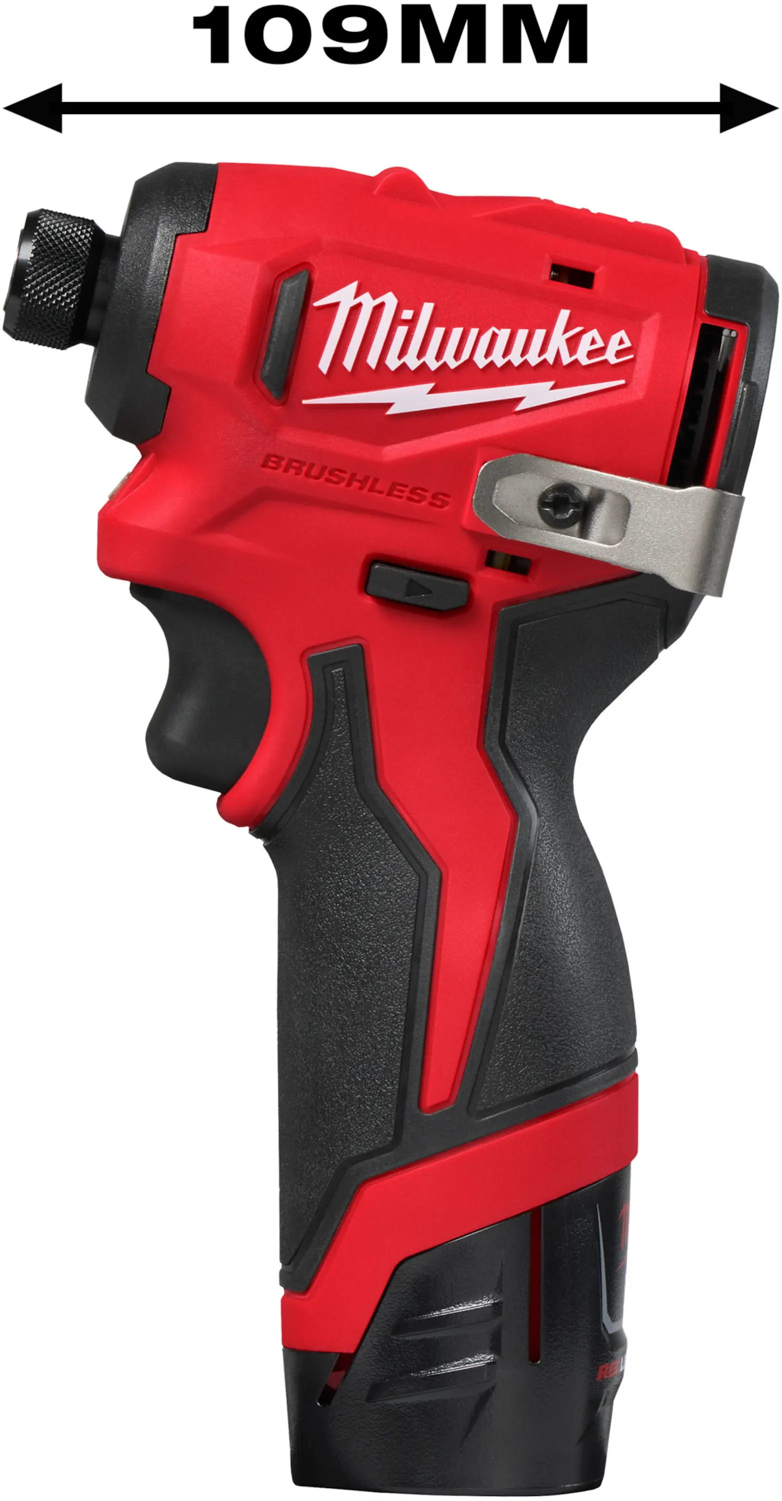 Akumulátorový rázový šroubovák M12 BLIDRC-202C, 2x akumulátor M12 B2 (12 V / 2.0 Ah), aku nabíječka M12 C12 C, s kufrem. Šestrihranné vnitřní uchycení HEX 1/4". Aku rázový šroubovák s točivým momentem 124 Nm. Rychlost 0-3000 ot/min. Počet úderů