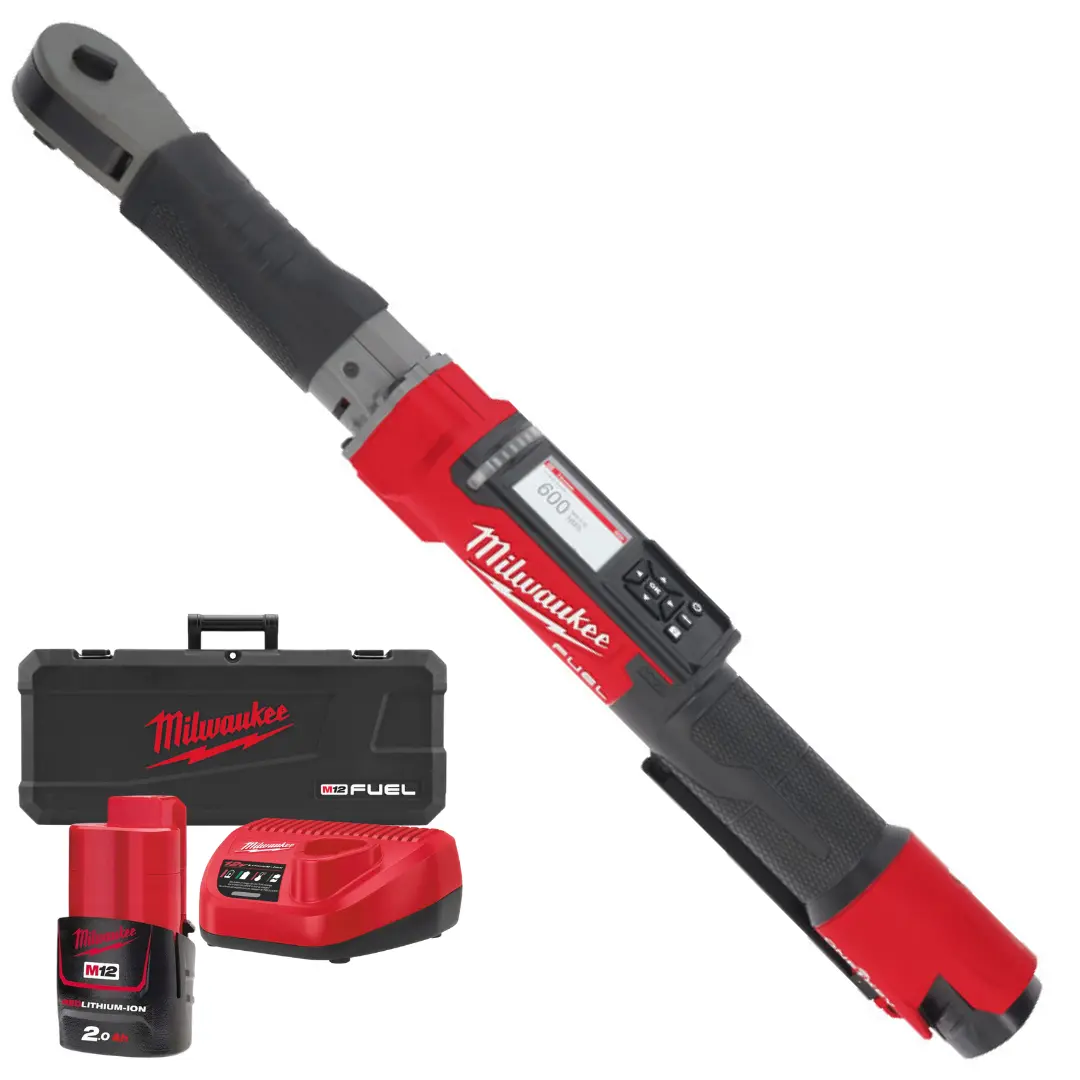 Akumulátorový digitální ráčnový utahovák Milwaukee M12 NEFTR12-201C, s nastavitelným momentem, s akumulátorem M12 B2 (12 V / 2,0 Ah) a nabíječkou M12 C12 C, s kufrem. Čtyřhranné uchycení 1/2". Aku digitální ráčnový utahovák s LCD displejem, toč