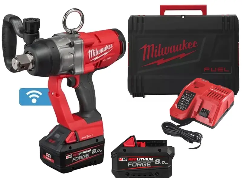 Akumulátorový rázový utahovák Milwaukee ONEFHIWF1-802X, balení s 2x akumulátorem M18 FB8 (18 V / FORGE 8,0 Ah), aku nabíječkou M12-18 FC a HEAVY DUTY kufrem (HD BOX).