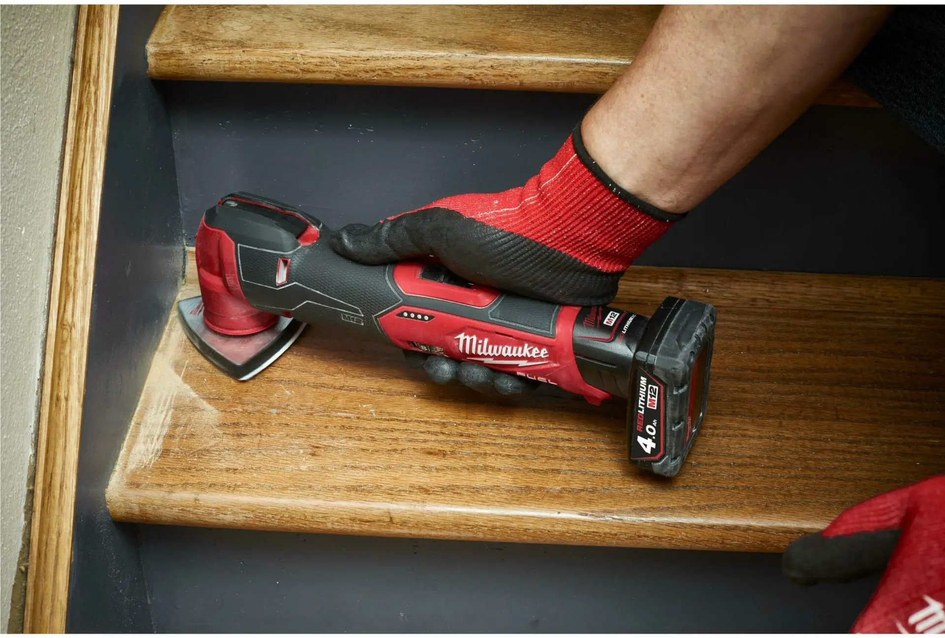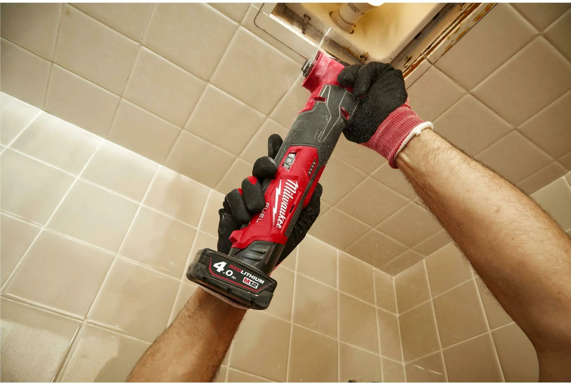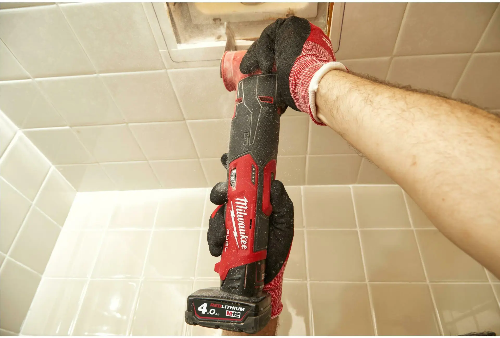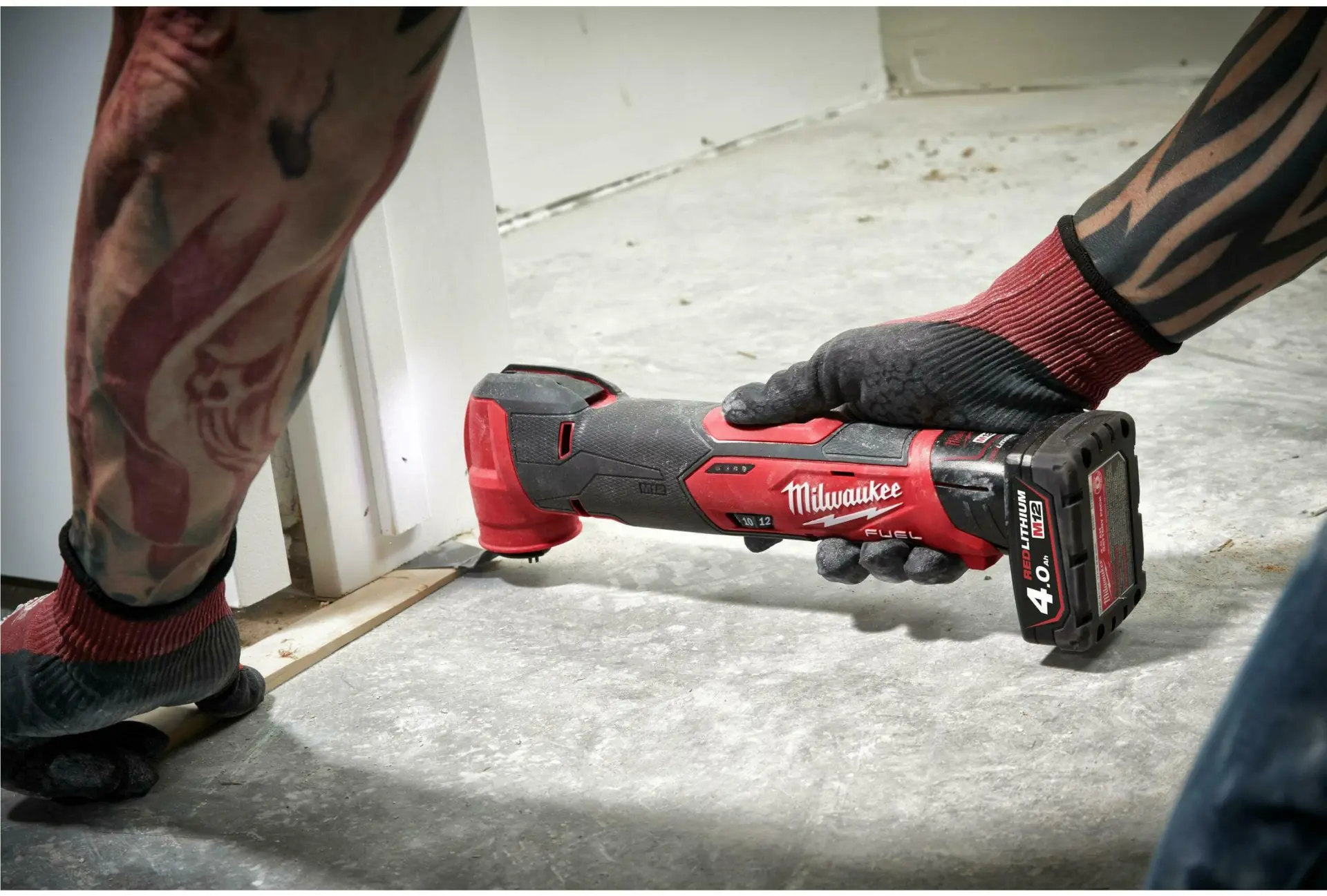 Multifunkční oscilační bruska Milwaukee M12 FMT-0, ekonomické balení bez akumulátoru, nabíječky a bez kufru, s příslušenstvím. Motor POWERSTATE, systém REDLINK PLUS, beznástrojová výměna příslušenství FIXTEX, Akumulátory REDLITHIUM M12, LED světlo,