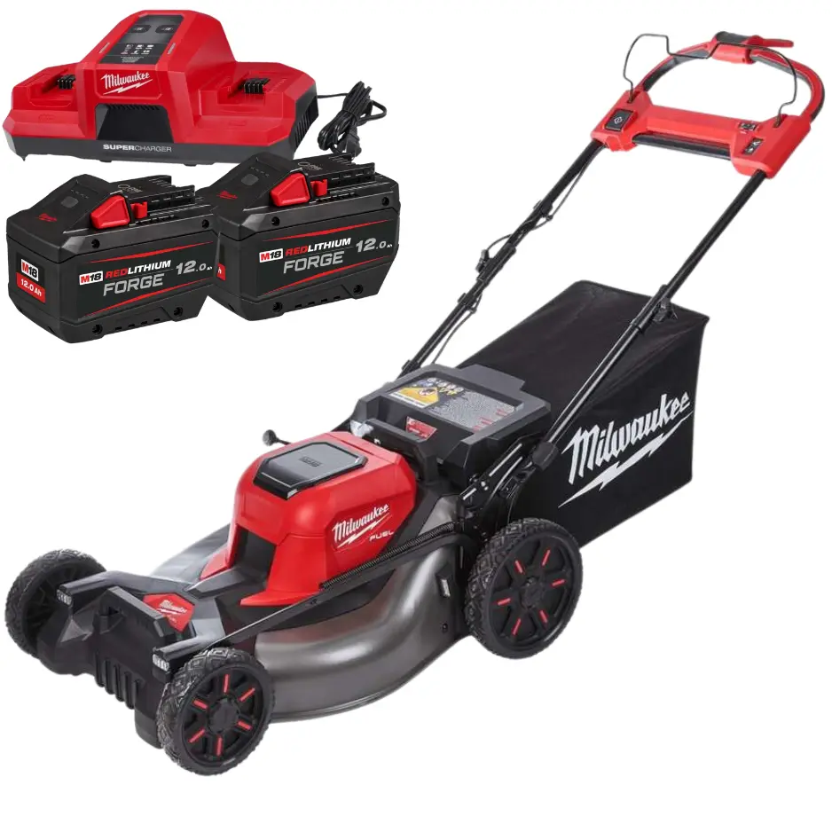 Akumulátorová sekačka na trávu Milwaukee M18 F2LM53-122, záběr nože 53 cm, výška sečení: 7 poloh od 2,5 cm do 10 cm, pomocný motorový pojezd s 5 rychlostmi (až 6,4 km/h), odnímatelný sběrný 70l koš a mulčovací adaptér, balení s 2ks akumulátoru M18 FB