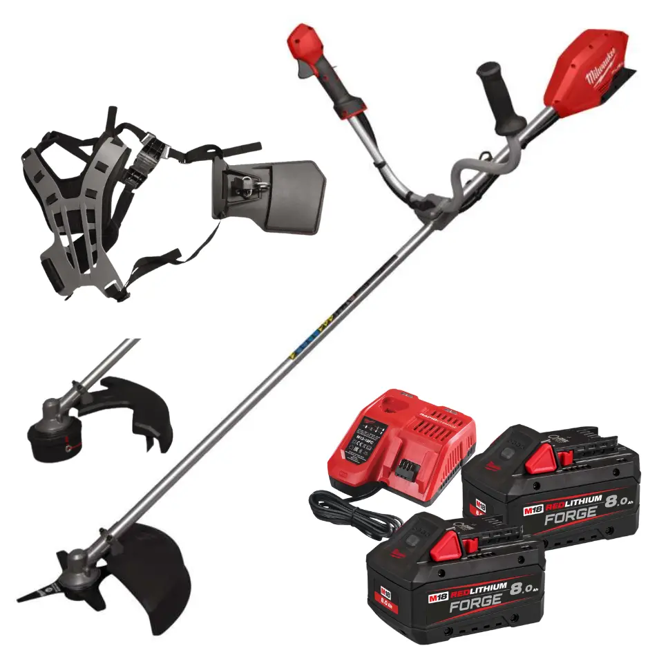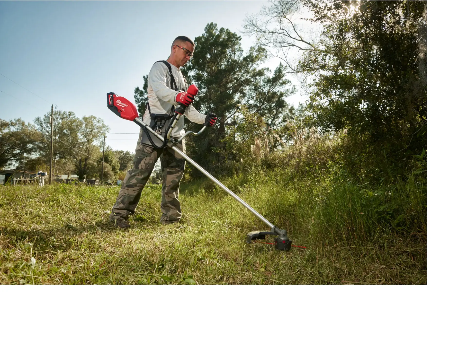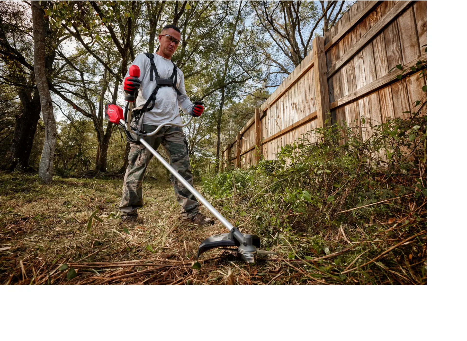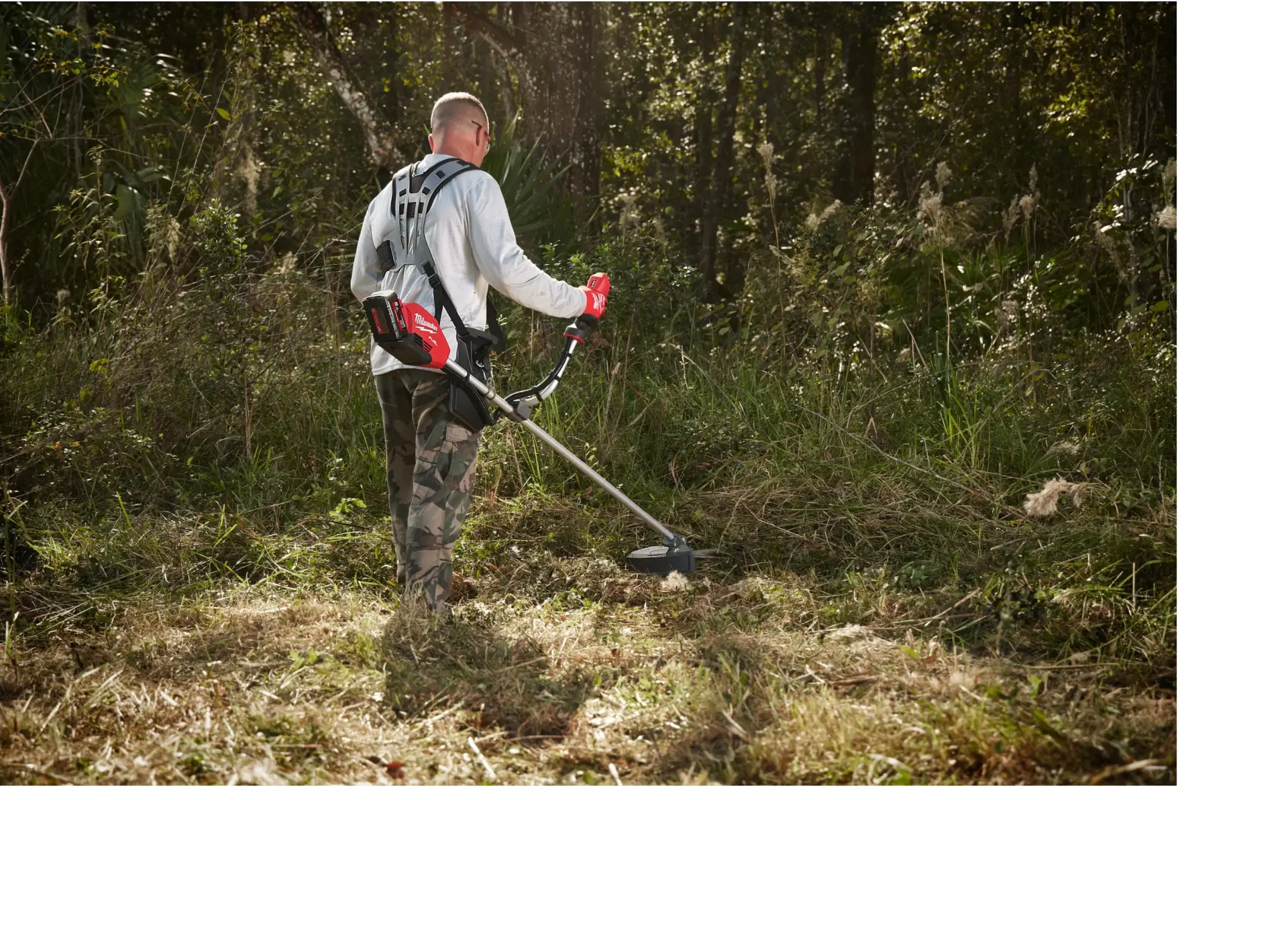 Akumulátorová strunová sekačka na trávu Milwaukee M18 FBCU-0, s ramením postrojem (popruh na záda). Zahradní nářadí s vyměnitelným nástavcem: strunový vyžínač / 4-břitý křovinořez, záběr struny 35-40 cm, vyměnitelná žací struna o průměru 2 mm a délko