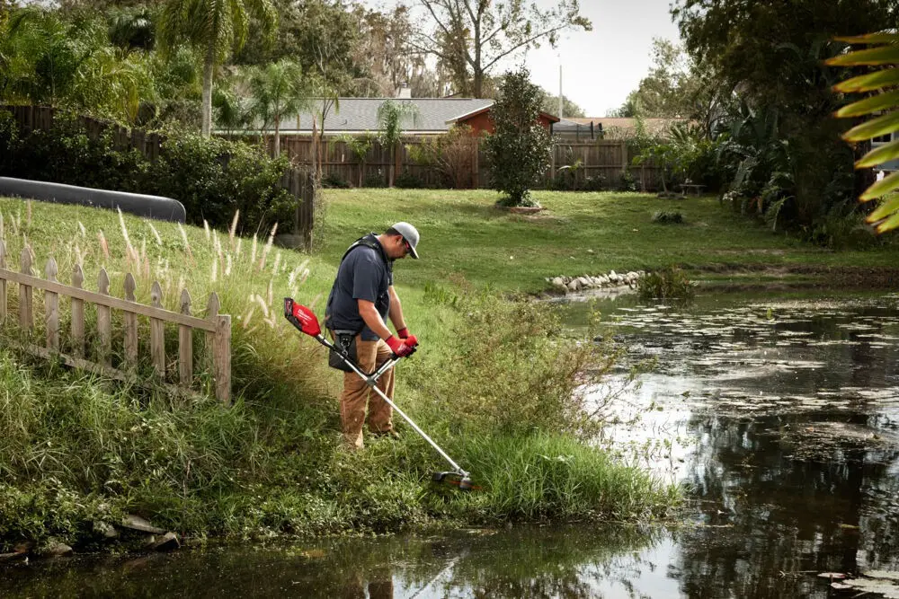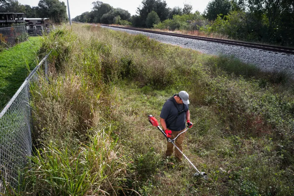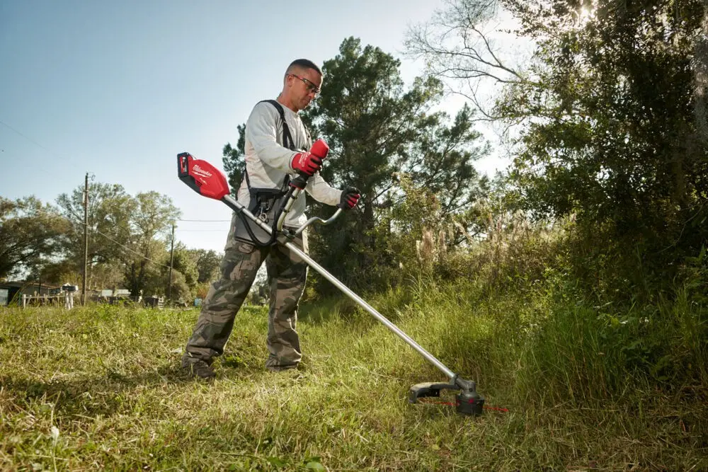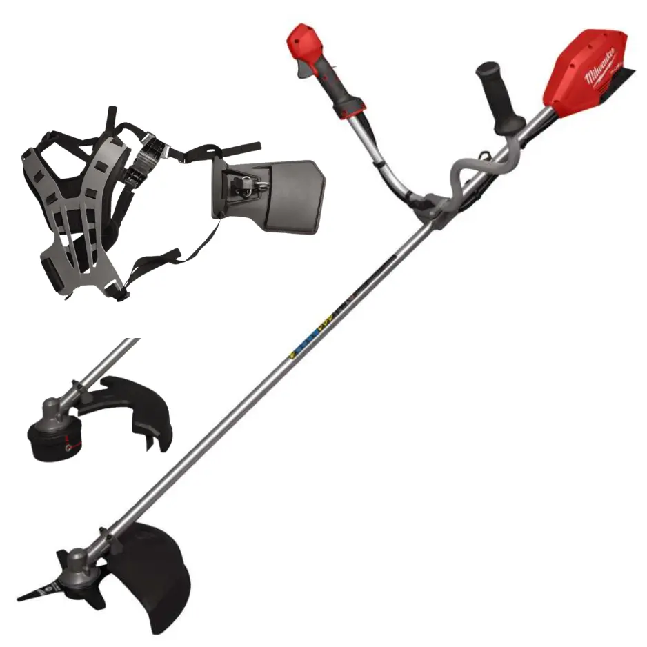 Akumulátorová strunová sekačka na trávu Milwaukee M18 FBCU-0, s ramením postrojem (popruh na záda). Zahradní nářadí s vyměnitelným nástavcem: strunový vyžínač / 4-břitý křovinořez, záběr struny 35-40 cm, vyměnitelná žací struna o průměru 2 mm, vyměni