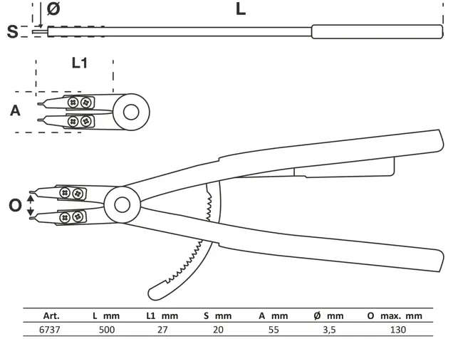 Kleště na rozpěrné kroužky rovné s délkou 500 mm umožňují snadnou montáž i demontáž vnitřních rozpěrných kroužků v těžko přístupných místech. Ergonomické rukojeti zajišťují pevný úchop při práci.