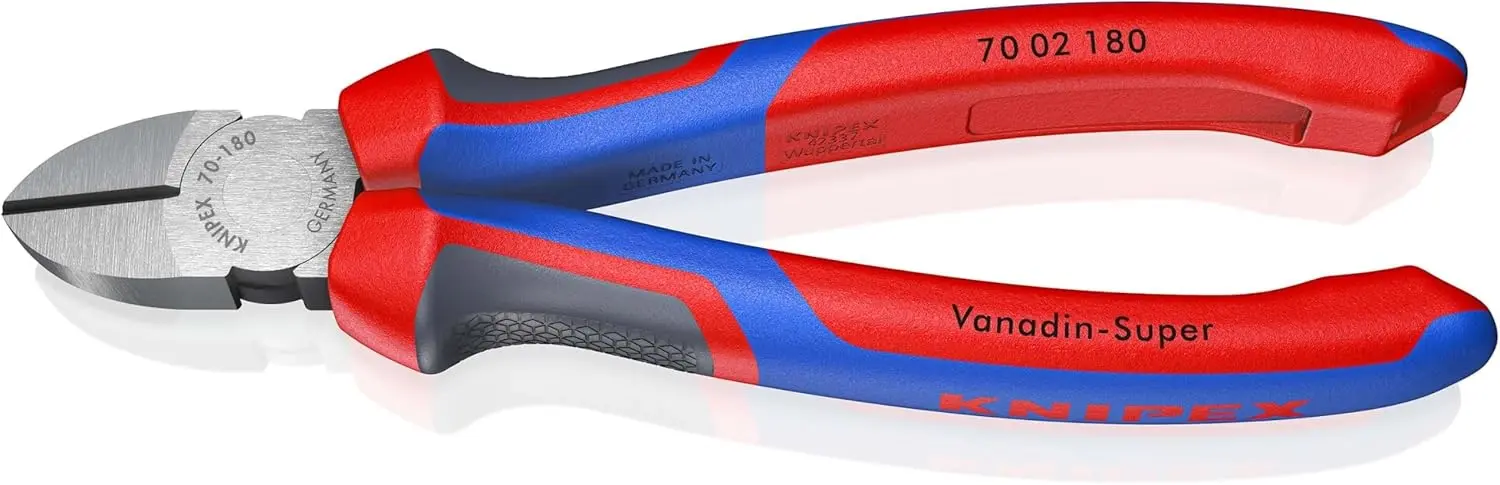 Kleště štípací boční Knipex 70 02 180 mají délku 180 mm, indukčně tvrzené břity a ergonomicky tvarované rukojeti pro přesné a efektivní stříhání drátů.
