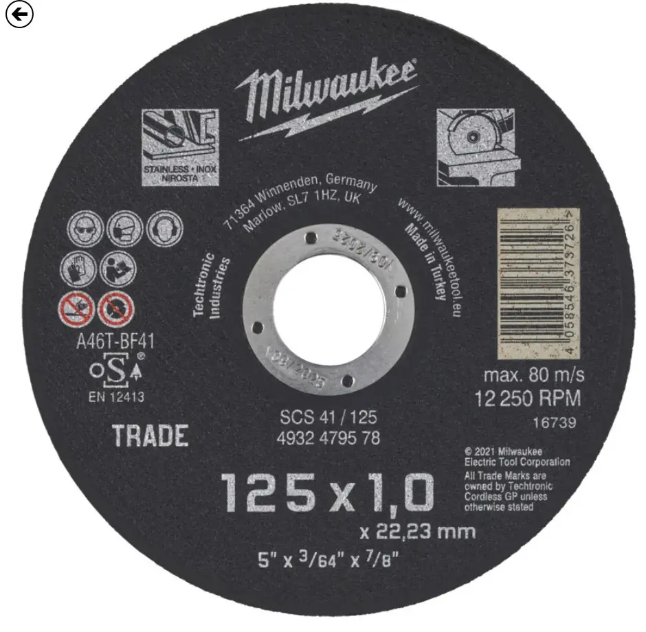 - Priemer [mm]: 125 - Maximálna rýchlosť [U.min-1]: 12 200 - Upínanie [mm]: 22,2 - Hrúbka kolesa [mm]: 1,0 - Obsah balenia [ks]: 1 - Hmotnosť [g]: 64 -- Univerzálny brúsny (rezný) kotúč Milwaukee na kovy - najmä nehrdzavejúcu oceľ - Použitie - Použitie: Najkvalitnejšie kotúče bez obsahu železa a síry na rezanie všetkých druhov ocele. Najvhodnejšie na rezanie nehrdzavejúcej a kyselinovzdornej ocele, hardoxu (plechu odolného proti opotrebovaniu), liatej žiaruvzdornej ocele, pružinovej ocele, mäkkej a nástrojovej ocele. - Vlastnosti kotúča: - o 30 % dlhšia životnosť - o 50 % rýchlejšie rezanie - o 50 % menej prachu - Znižuje straty materiálu- K dispozícii len vo veľkom (50 x 4932430445). Minimálne množstvo objednávky: 50 x 4932430445 (1 hromadné balenie). Objednávky na viac ako 50 kusov musia byť v násobkoch tohto počtu (napr. 100, 150, 200 ...). --