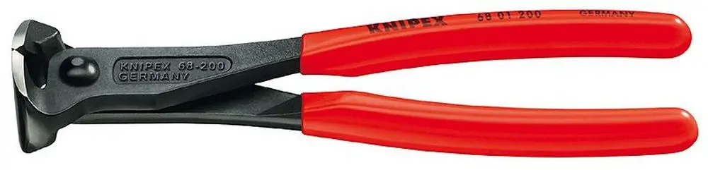 Čelní štípací kleště KNIPEX 68 01 200 s délkou 200 mm mají leštěnou hlavu a plastové návleky pro pevný úchop při práci s dráty. Vhodné pro přesné štípání v elektrotechnice i domácí dílně.