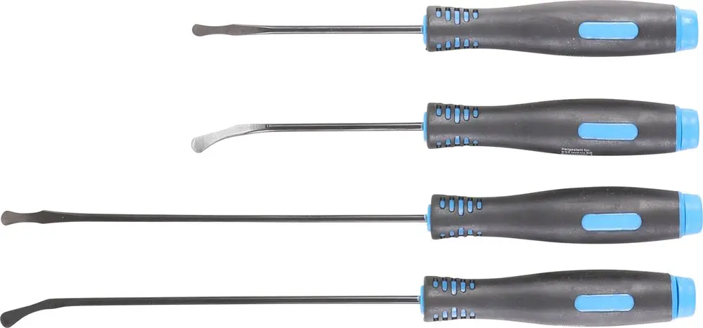 Sada čtyř háků BGS109439 s ergonomickými rukojeťmi a zaoblenými špičkami usnadňuje manipulaci při práci v dílně i domácnosti. Vhodné pro montáž, demontáž a detailní opravy.