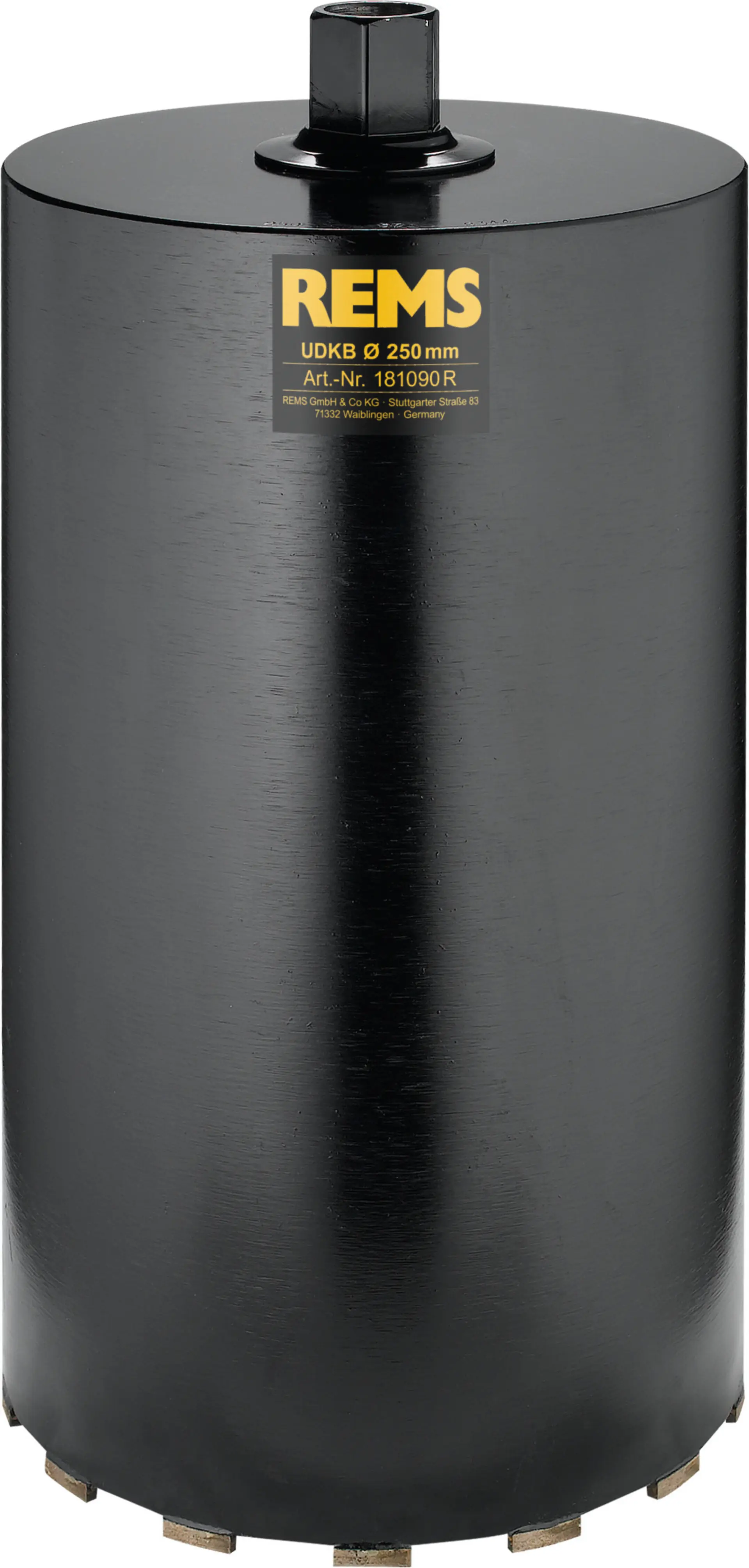 Diamantové jádrové vrtací korunky REMS - UDKB 250 x 420 mm. - Univerzálně použitelné k vrtání na sucho i na mokro, ručně vedeným nebo s vrtacím stojanem. - Připojovací závit UNC 1 1/4" vnitřní. - Vrtací hloubka 420 mm. - Speciálně vyvinuté, vysoc