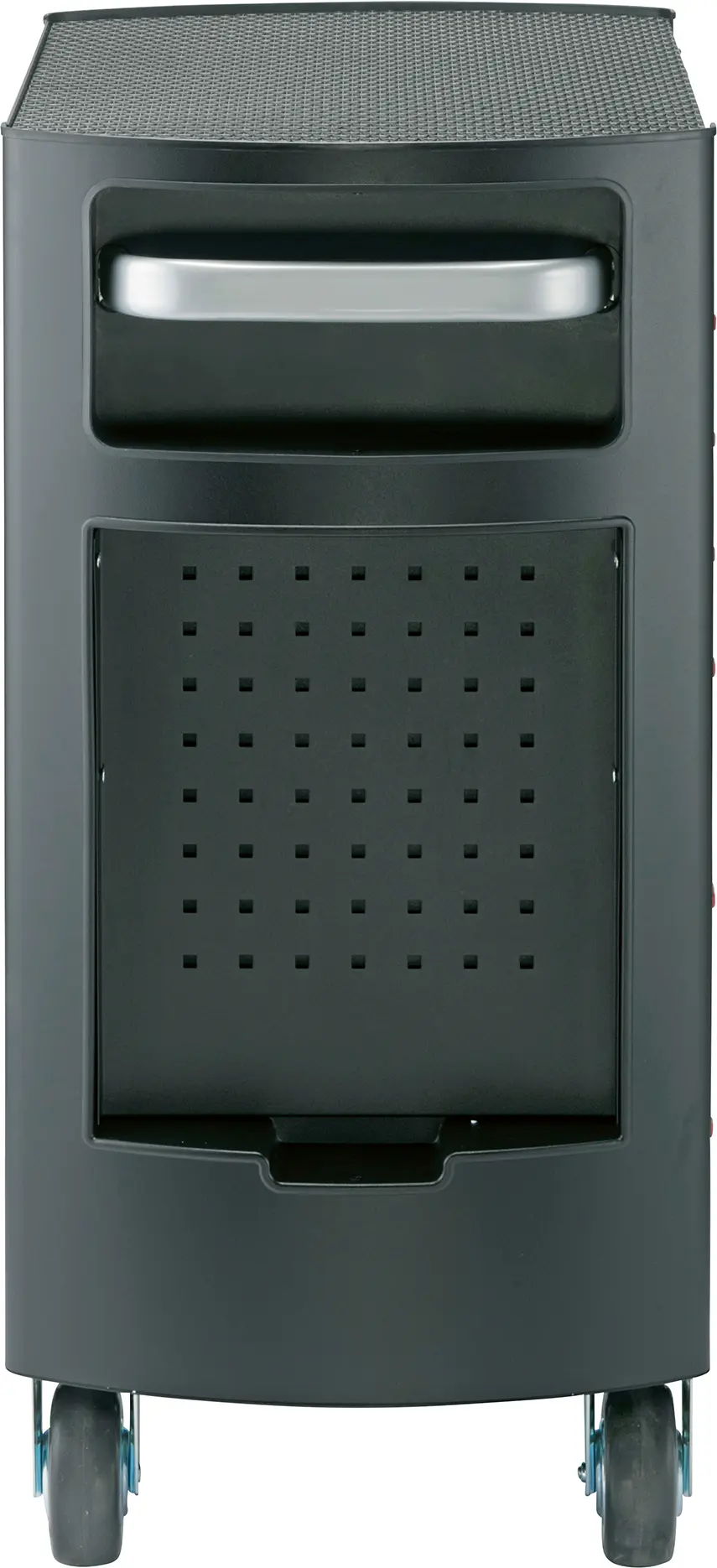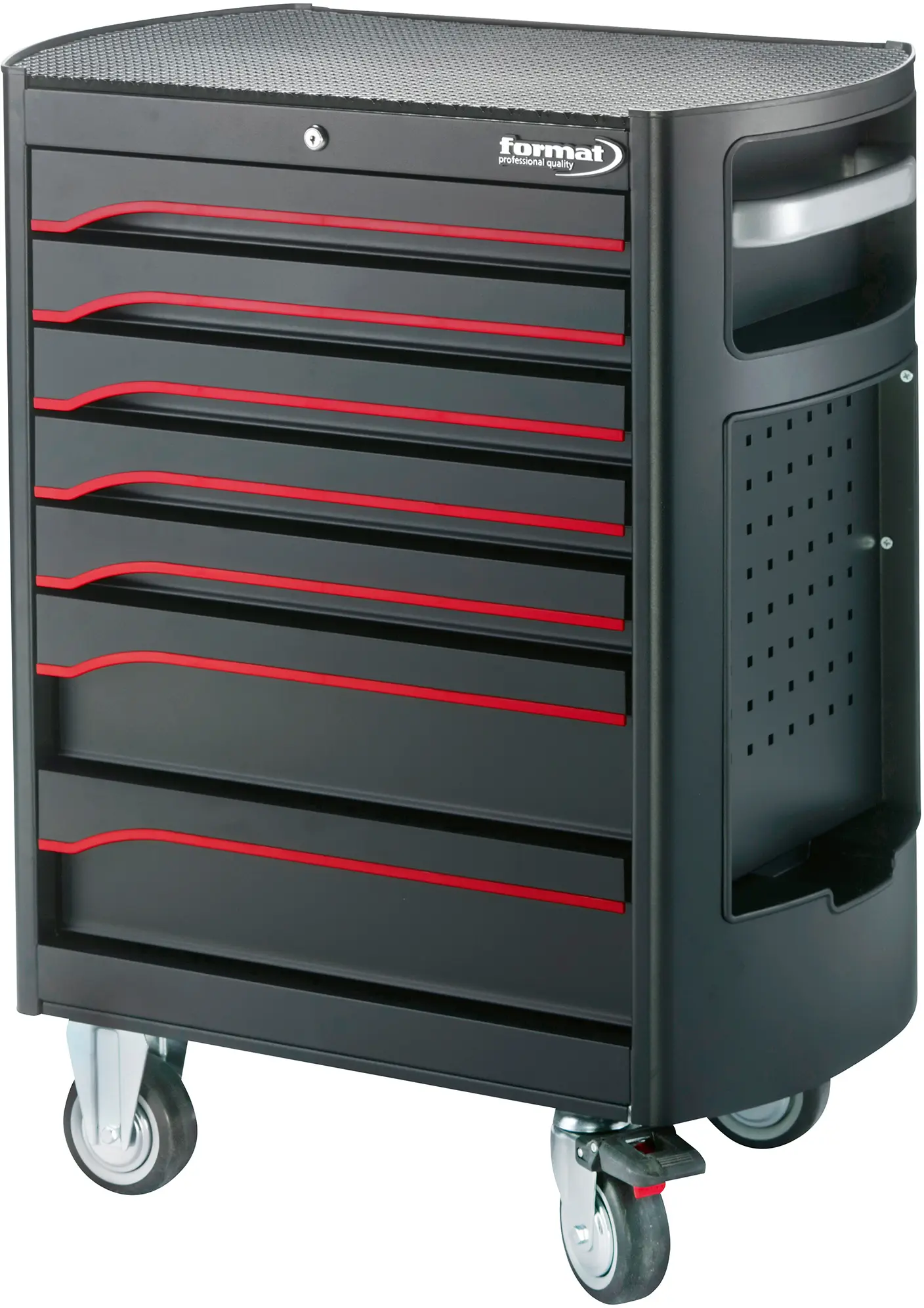 Prevedenie: Stabilná konštrukcia z oceľového plechu, zásuvky (všetky s možnosťou individuálneho rozdelenia) s plným výsuvom, jednotlivé blokovanie proti nežiaducemu otvoreniu počas presunu a vodiace koľajnice s guličkovými ložiskami. Na oboch stranách sa štvorcovým dierovaním (9 x 9 mm) pre upevnenie rôzneho príslušenstva. Centrálne uzamykateľný pomocou valčekového zámku. 2 vnútri umiestnená celogumená pojazdná kolieska a 2 celogumená otočné kolieska s brzdou koliesok na jednej strane (úplné zastavenie). Všetky kolieska sú uložené na guličkových ložiskách pre optimálny jazdný komfort. Povrch s práškovým povrstvením.