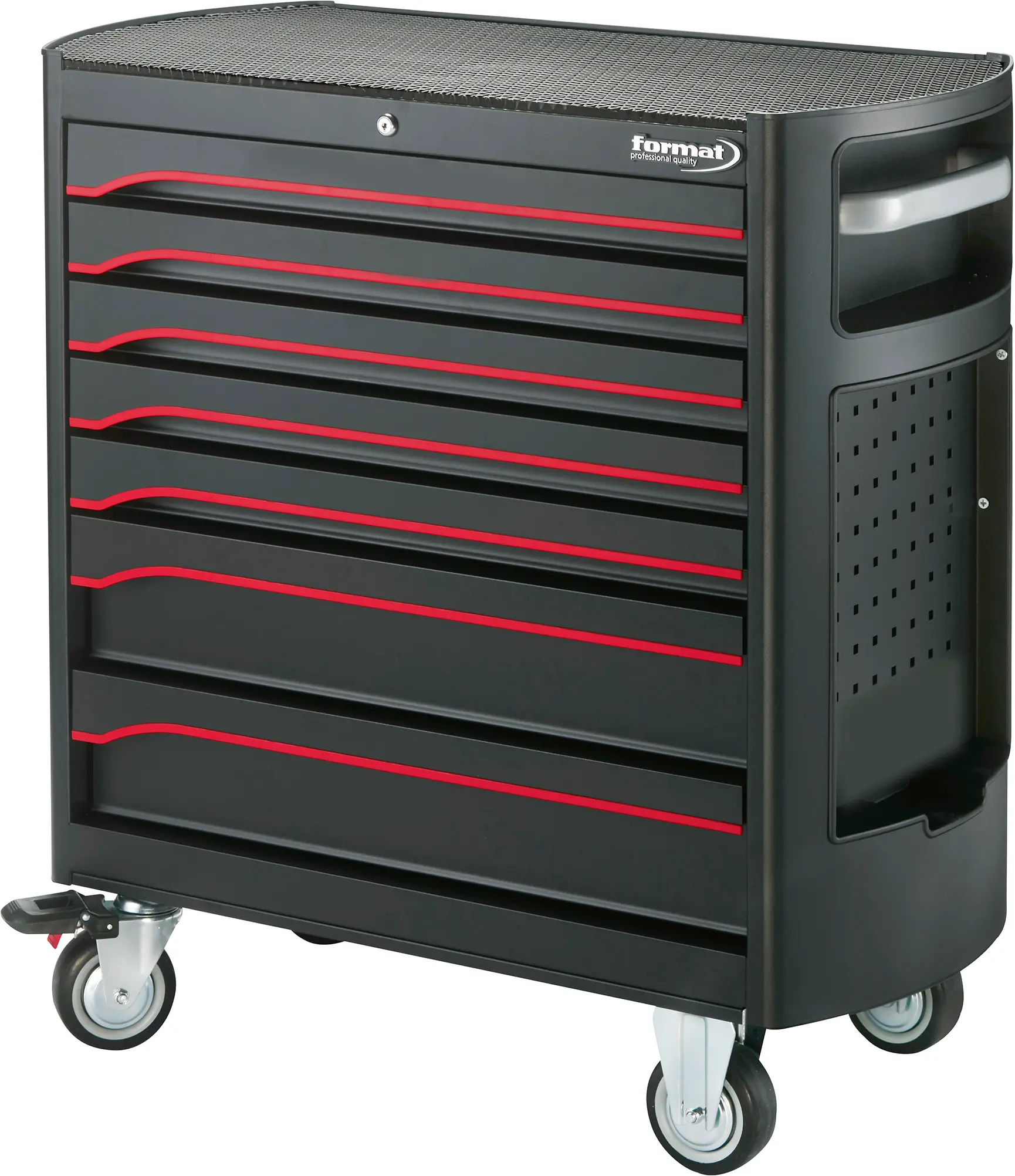 Prevedenie: Stabilná konštrukcia z oceľového plechu, zásuvky (všetky s možnosťou individuálneho rozdelenia) s plným výsuvom, jednotlivé blokovanie proti nežiaducemu otvoreniu počas presunu a vodiace koľajnice s guličkovými ložiskami. Na oboch stranách sa štvorcovým dierovaním (9 x 9 mm) pre upevnenie rôzneho príslušenstva. Centrálne uzamykateľný pomocou valčekového zámku. 2 vnútri umiestnená celogumená pojazdná kolieska a 2 celogumená otočné kolieska s brzdou koliesok na jednej strane (úplné zastavenie). Všetky kolieska sú uložené na guličkových ložiskách pre optimálny jazdný komfort. Povrch s práškovým povrstvením.