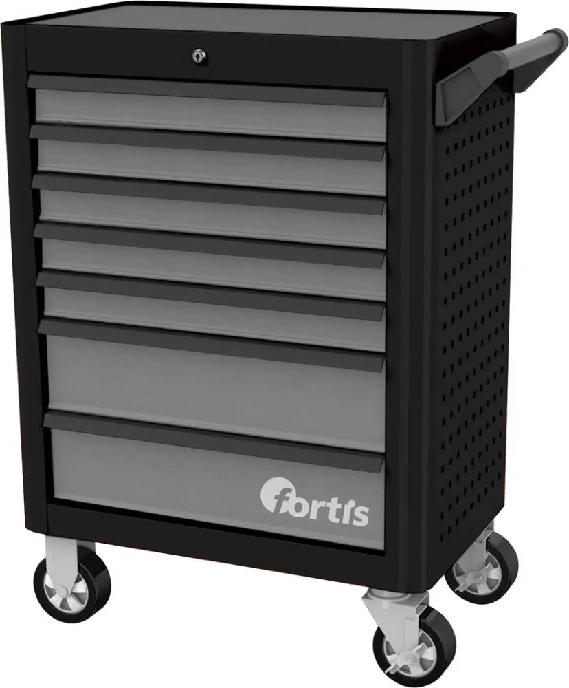 Prevedenie: Stabillní konštrukcia z oceľového plechu so 7 zásuvkami vysunutelnými do jednej strany (5 x 75; 2 x 154 mm vysoké, všetky jednotlivo rozdeliteľné as ochrannou podložkou s hrúbkou 2,5 mm na ochranu spodnej časti zásuvky), v úplným výsuvom, s vodiacimi koľajničkami na guľkových ložiskách. Na oboch stranách sa štvorcovým dierovaním (9 x 9 mm) pre upevnenie rôzneho príslušenstva. Centrálne uzamykateľný pomocou valčekového zámku. Pracovná plošina s ryhovanou gumovou podložkou. 2 pojazdové a 2 otočné kolieska. Povrch s práškovým povrstvením, čierny korpus, šedej zásuvky.