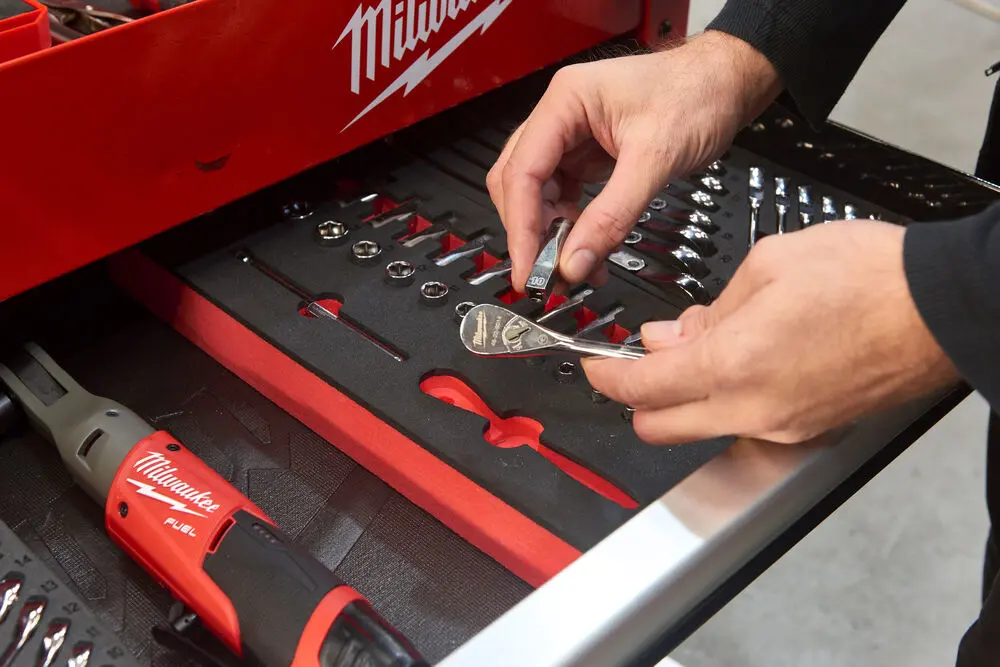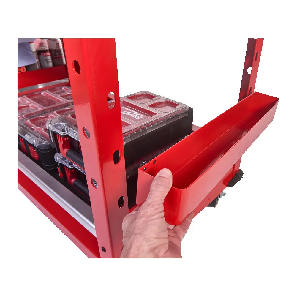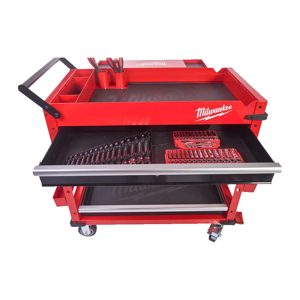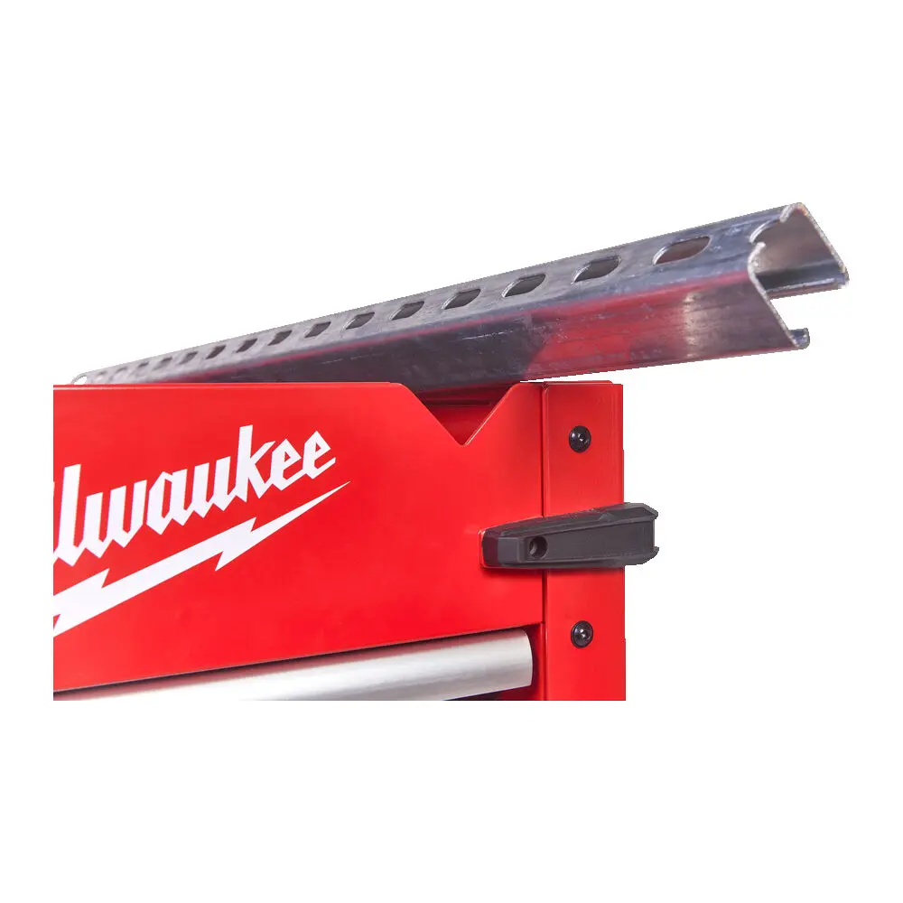 Oceľový dielenský vozík Milwaukee (102 cm) - Celková nosnosť 315 kg - Zásuvka s mäkkým dorazom dimenzovaná na 45 kg - Spodná polica zásuvky s nosnosťou 90 kg - Zabudované priehradky - 2 odnímateľné odkladacie priehradky, ktoré možno prevrátiť hore nohami a vytvoriť tak rovnú plochu, alebo úplne vybrať na vertikálne uloženie dlhého náradia - Drážky na pridržiavanie materiálu pri rezaní alebo meraní - Sklopná zadná polica s nosnosťou 22 kg - 2 odnímateľné police na odkladanie fliaš, sprejov a podobného vybavenia - Gumové rohové nárazníky zabraňujú poškodeniu skrinky pri prevážaní v garáži - Magnetické napájacie lišty umožňujú nabíjanie batérií priamo na telese - Priemyselné kolieska s priemerom 125 mm (2 pevné a 2 radiálne)