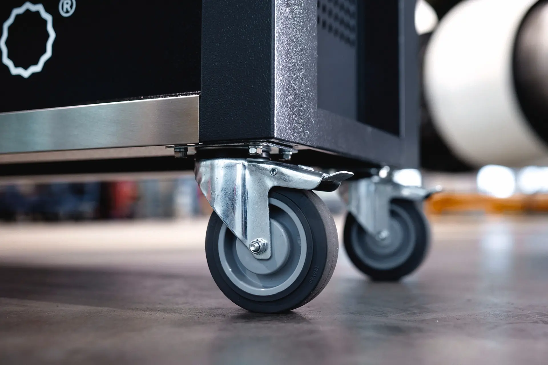 Oleji a kyselinám odolné ľahké kolesá s guličkovým vedením (pr. 125 mm) s ochranou proti trieskam, ktorá chráni ložiská pred nečistotami a trieskami, s dvoma parkovacími brzdami