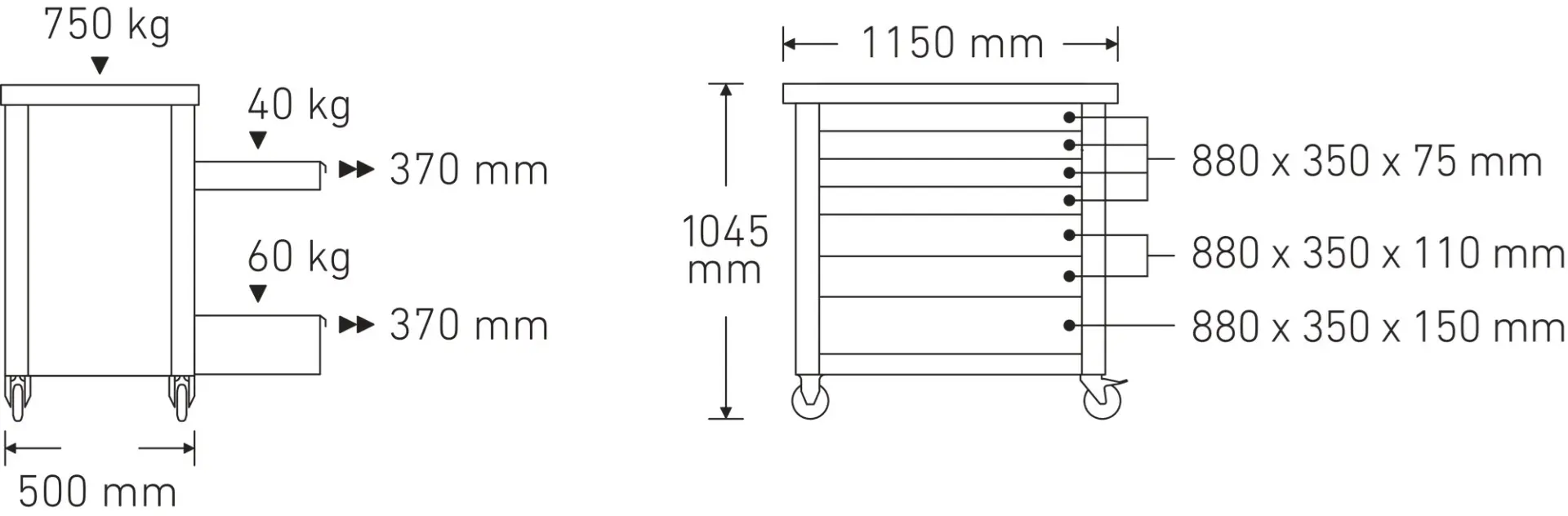 Rozmery zásuvky 880 x 350 mm, vnútorná výška zásuvky: 4x 75 mm, 2x 110 mm a 1x 150 mm