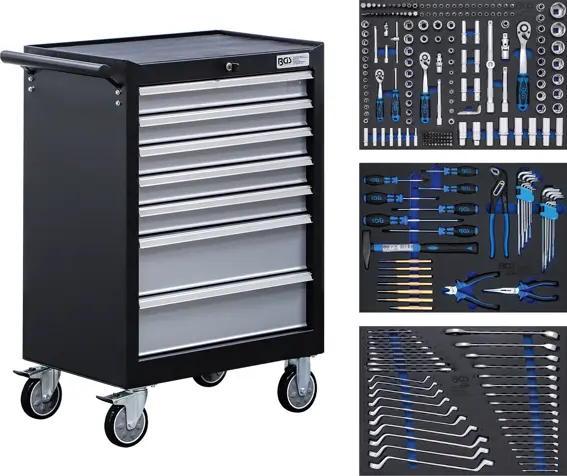 Pojazdný náraďový vozík BGS technic so 7 zásuvkami a 263 ks náradia