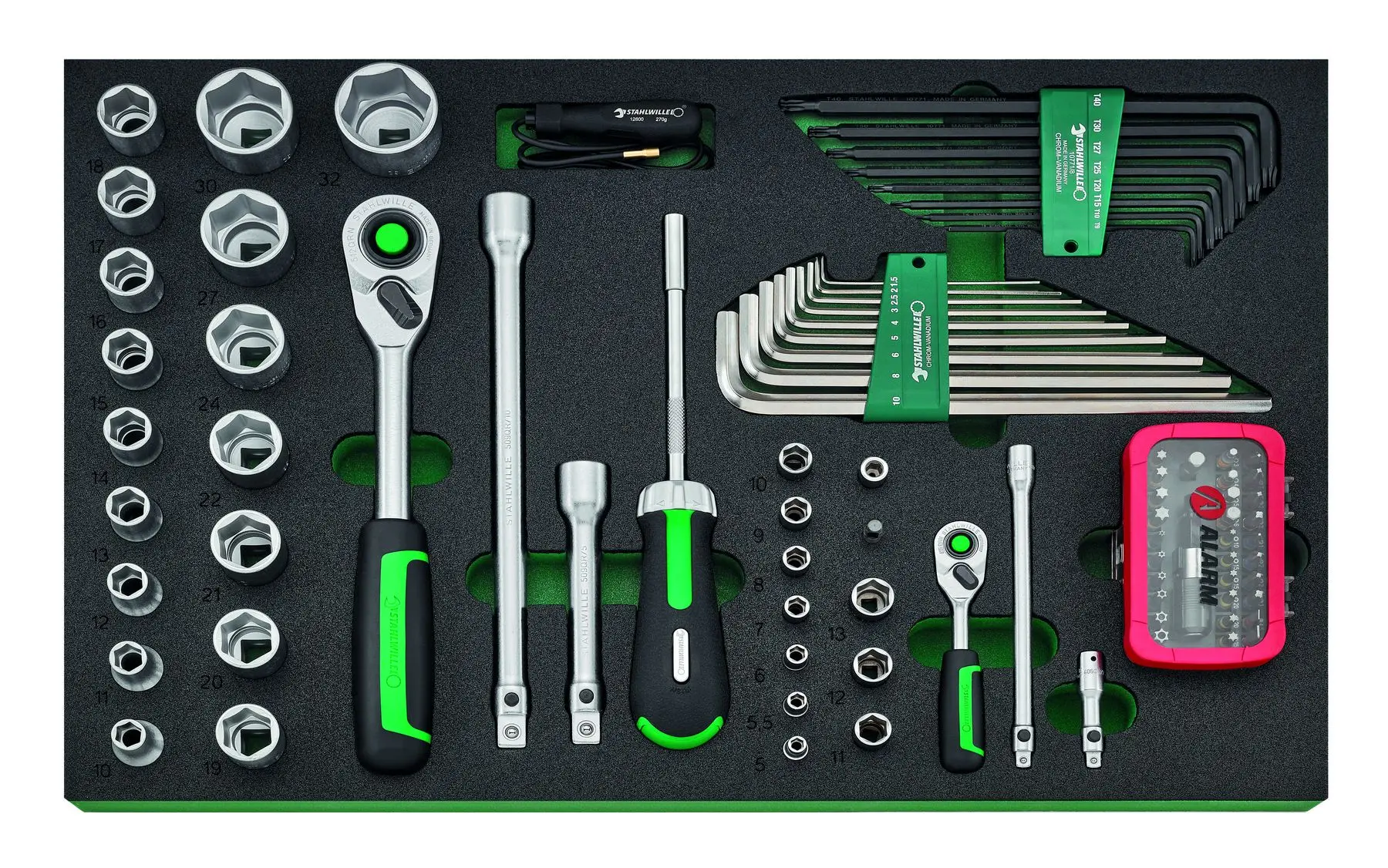 • nástrčné kľúče 1/4" a 1/2" (5 ÷ 32 mm), račne a nástavce