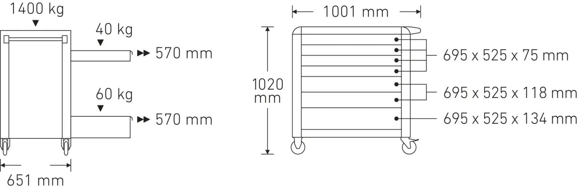 • 1x zásuvka (nosnosť [kg]: 40) [mm]: 695 x 525 x 118