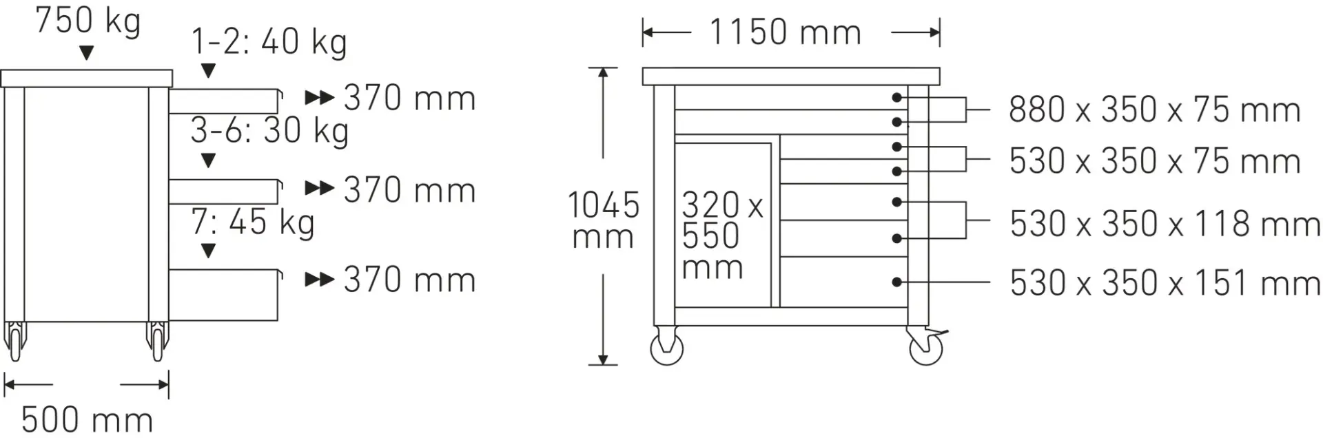 Dielenský pojazdný pracovný stôl Stahlwille - 7 zásuviek. 500 x 1150 x 1045 mm