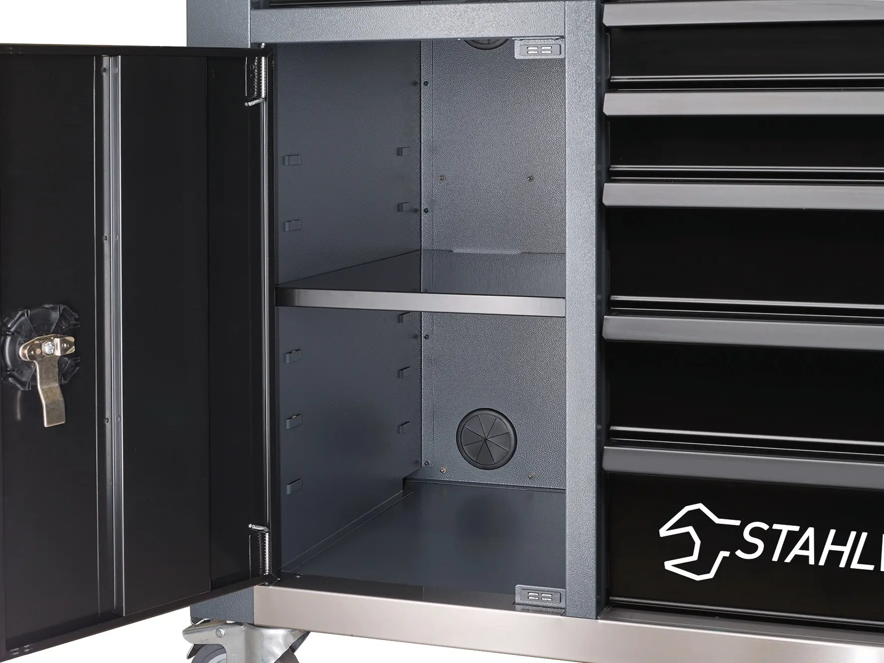 • Samostatná uzamykateľná skriňová časť s magnetickým držiakom a výškovo nastaviteľným medziposchodím (70 mm mriežka)