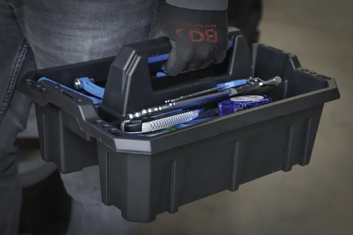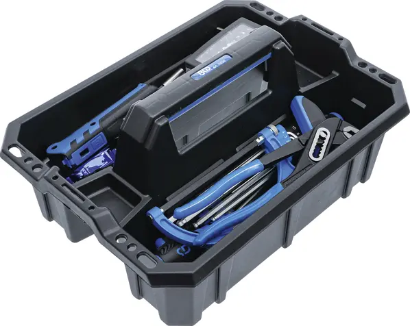 Otvorený prenosný box s dvoma veľkými priehradkami na prepravu náradia a malých dielov