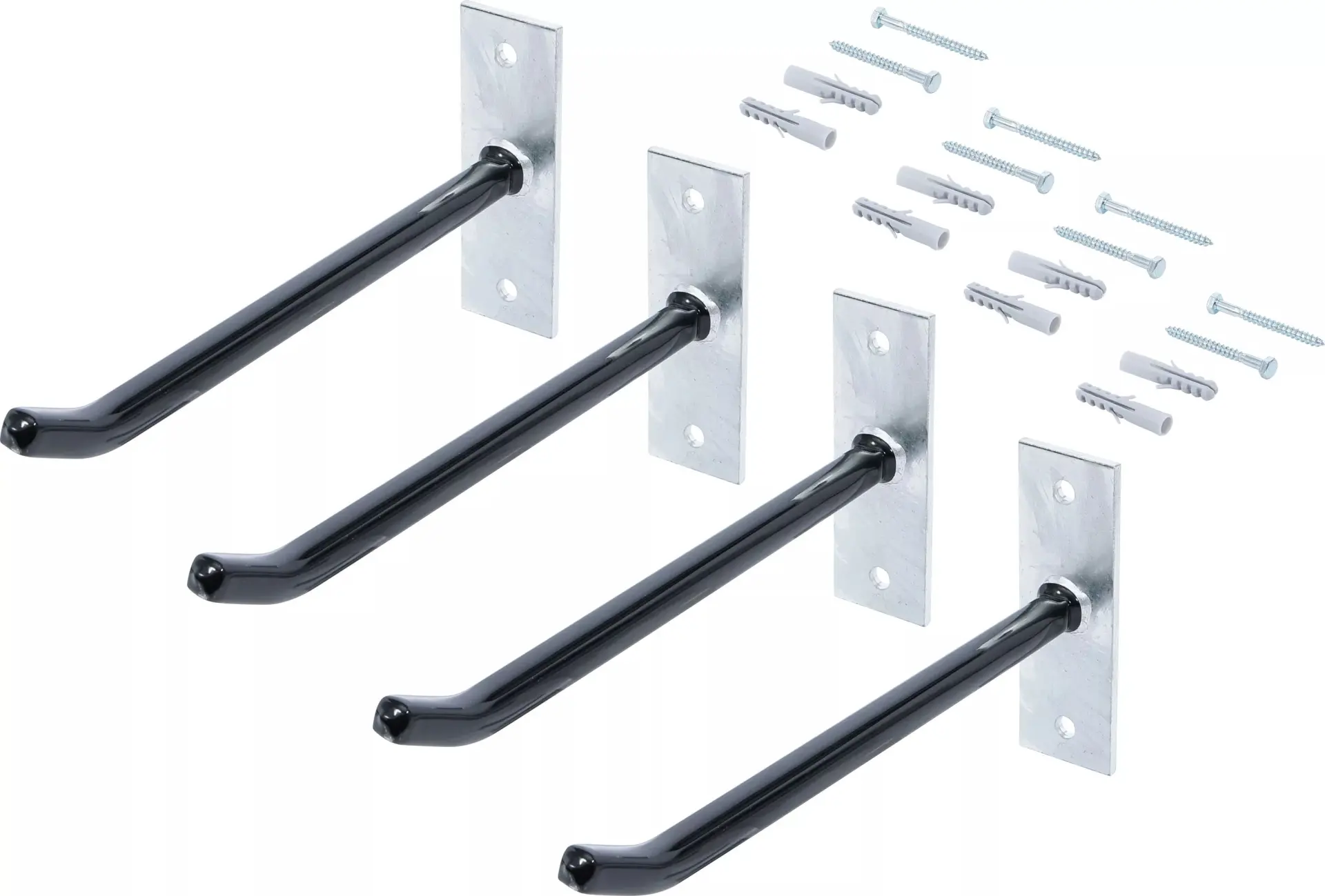 Sada čtyř nástěnných háků o délce 250 mm umožňuje přehledné zavěšení disků kol v dílně nebo garáži. Robustní kovové provedení zajišťuje dlouhou životnost.