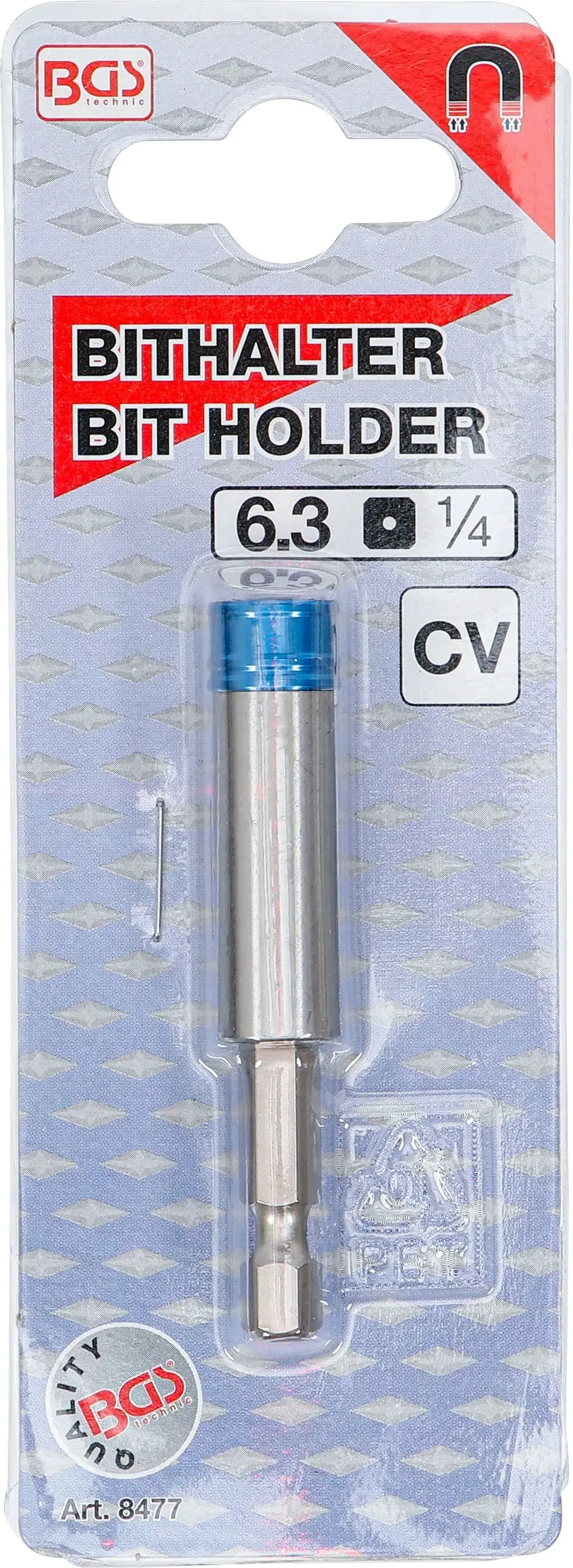 Držák bitu s rychloupínacím systémem 6,3 mm (1/4") BGS108477 umožňuje snadnou a rychlou výměnu bitů, kompatibilní s běžnými šroubováky a vrtačkami. Robustní konstrukce zajišťuje dlouhou životnost při každodenním používání.