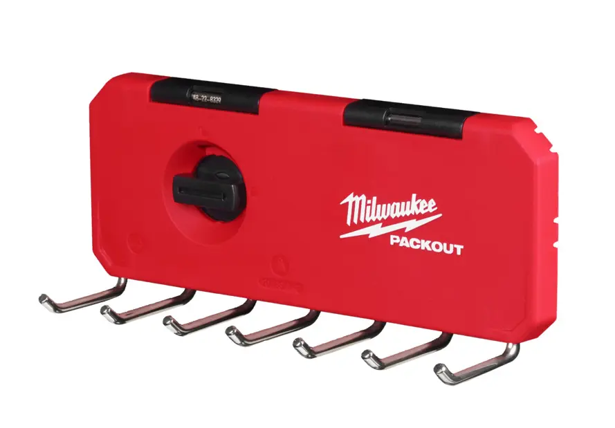 Držák se 7 háčky Milwaukee PACKOUT™ umožňuje přehledné zavěšení nářadí a příslušenství, je kompatibilní se systémem PACKOUT™ a nabízí snadnou montáž na stěnu.