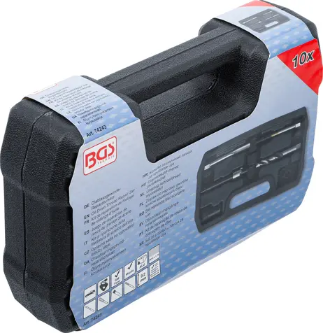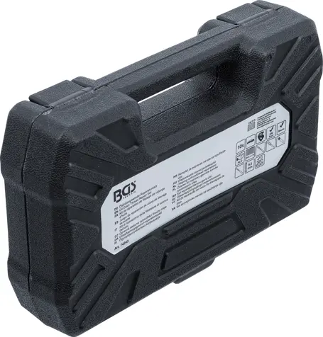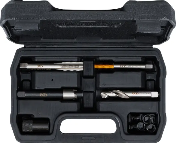 Sada nástrojů BGS1074243 umožňuje efektivní opravy závitů hliníkových olejových van bez nutnosti demontáže, obsahuje různé velikosti závitníků a vložek. Vhodné pro profesionální i domácí použití při údržbě automobilů.