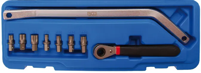 Sada pro montáž dveřních závěsů automobilů BGS108415 obsahuje specializované nástroje pro přesné usazení a demontáž závěsů, vhodné pro různé typy vozidel. Robustní konstrukce zajišťuje dlouhou životnost při opakovaném použití v dílenském prostředí.