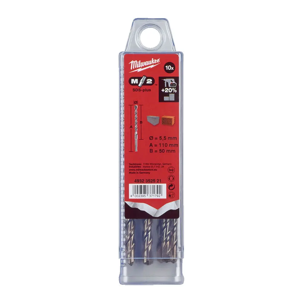Tato sada obsahuje 10 kusů vrtáků SDS-Plus M2 s průměrem 5,5 mm, pracovní délkou 50 mm a celkovou délkou 110 mm. Vrtáky jsou určeny pro použití s příklepovými vrtačkami vybavenými upínáním SDS-Plus, což zajišťuje rychlou a pevnou fixaci nástroje během práce.
